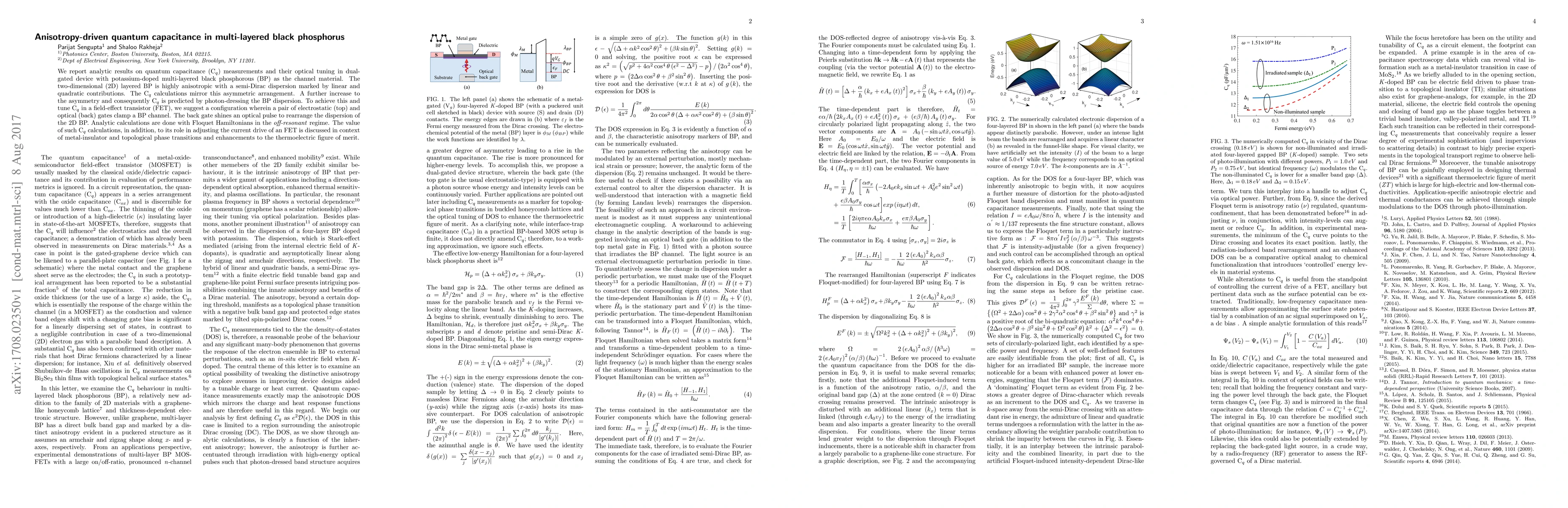 We report analytic results on quantum capacitance (C$_{q}$) measurements and their optical tuning in dual-gated device with potassium-doped multi-layered black phosphorous (BP) as the channel material. The two-dimensional (2D) layered BP is highly anisotropic with a semi-Dirac dispersion marked by linear and quadratic contributions. The C$_{q}$ calculations mirror this asymmetric arrangement. A further increase to the asymmetry and consequently C$_{q}$ is predicted by photon-dressing the BP dispersion. To achieve this and tune C$_{q}$ in a field-effect transistor (FET), we suggest a configuration wherein a pair of electrostatic (top) and optical (back) gates clamp a BP channel. The back gate shines an optical pulse to rearrange the dispersion of the 2D BP. Analytic calculations are done with Floquet Hamiltonians in the off-resonant regime. The value of such C$_{q}$ calculations, in addition, to its role in adjusting the current drive of an FET is discussed in context of metal-insulator and topological phase transitions and enhancements to the thermoelectric figure of merit.