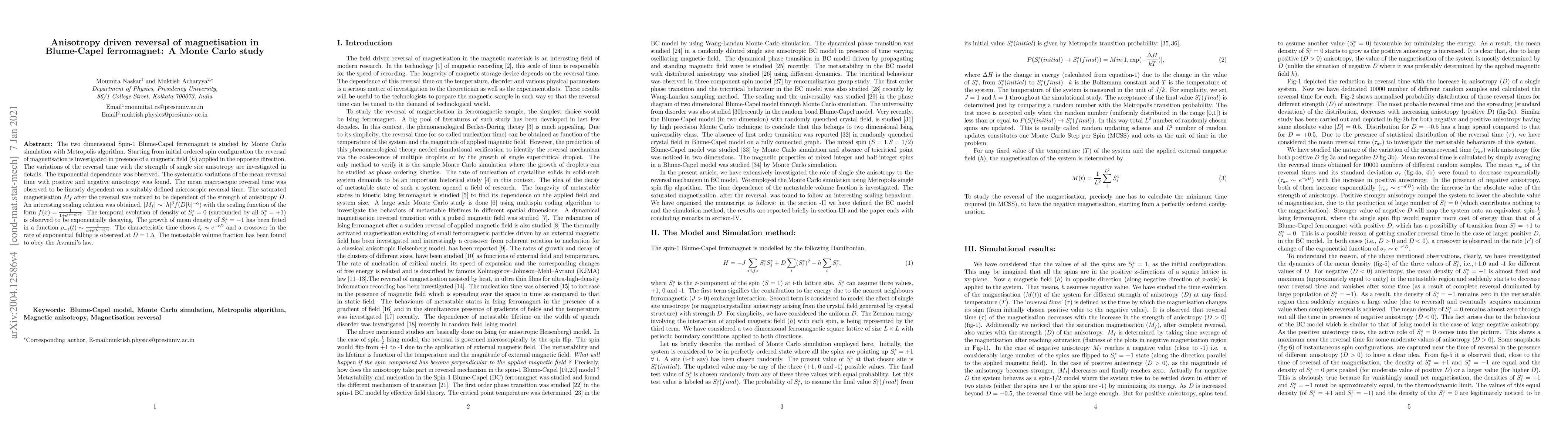 The two dimensional Spin-1 Blume-Capel ferromagnet is studied by Monte Carlo simulation with Metropolis algorithm. Starting from initial ordered spin configuration the reversal of magnetisation is investigated in presence of a magnetic field ($h$) applied in the opposite direction. The variations of the reversal time with the strength of single site anisotropy are investigated in details. The exponential dependence was observed. The systematic variations of the mean reversal time with positive and negative anisotropy was found. The mean macroscopic reversal time was observed to be linearly dependent on a suitably defined microscopic reversal time. The saturated magnetisation $M_f$ after the reversal was noticed to be dependent of the strength of anisotropy $D$. An interesting scaling relation was obtained, $|M_f| \sim |h|^{\beta}f(D|h|^{-\alpha})$ with the scaling function of the form $f(x)= \frac{1}{1+e^{(x-a)/b}}$. The temporal evolution of density of $S_i^z=0$ (surrounded by all $S_i^z=+1$) is observed to be exponentially decaying. The growth of mean density of $S_i^z=-1$ has been fitted in a function $\rho_{-1}(t) \sim \frac{1}{a+e^{(t_c-t)/c}}$. The characteristic time shows $t_c \sim e^{-rD}$ and a crossover in the rate of exponential falling is observed at $D=1.5$. The metastable volume fraction has been found to obey the Avrami's law.