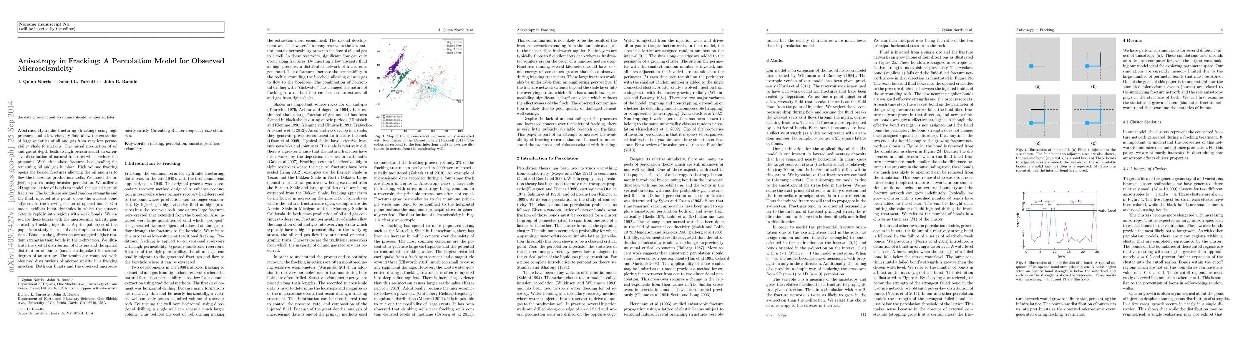 Hydraulic fracturing (fracking) using high pressures and a low viscosity fluid allow the extraction of large quantiles of oil and gas from very low permeability shale formations. The initial production of oil and gas at depth leads to high pressures and an extensive distribution of natural fractures which reduce the pressures. With time these fractures heal, sealing the remaining oil and gas in place. High volume fracking opens the healed fractures allowing the oil and gas to flow the horizontal productions wells. We model the injection process using invasion percolation. We utilize a 2D square lattice of bonds to model the sealed natural fractures. The bonds are assigned random strengths and the fluid, injected at a point, opens the weakest bond adjacent to the growing cluster of opened bonds. Our model exhibits burst dynamics in which the clusters extends rapidly into regions with weak bonds. We associate these bursts with the microseismic activity generated by fracking injections. A principal object of this paper is to study the role of anisotropic stress distributions. Bonds in the $y$-direction are assigned higher random strengths than bonds in the $x$-direction. We illustrate the spatial distribution of clusters and the spatial distribution of bursts (small earthquakes) for several degrees of anisotropy. The results are compared with observed distributions of microseismicity in a fracking injection. Both our bursts and the observed microseismicity satisfy Gutenberg-Richter frequency-size statistics.