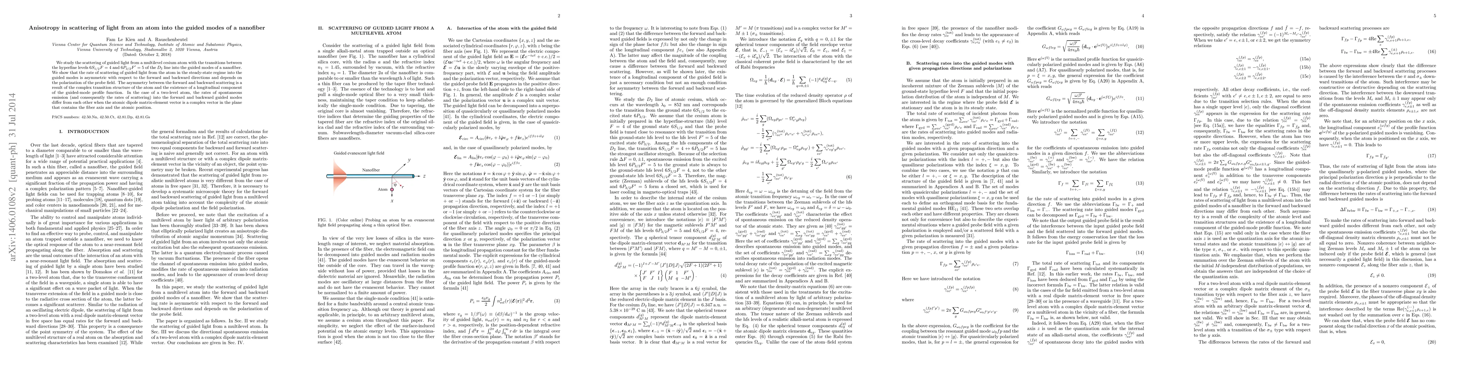 Researchers studied how light interacts with a cesium atom in a nanofiber, finding that the scattering rate is asymmetric and depends on the probe field's polarization. This asymmetry is due to the complex transition structure of the atom and its alignment with the fiber axis.