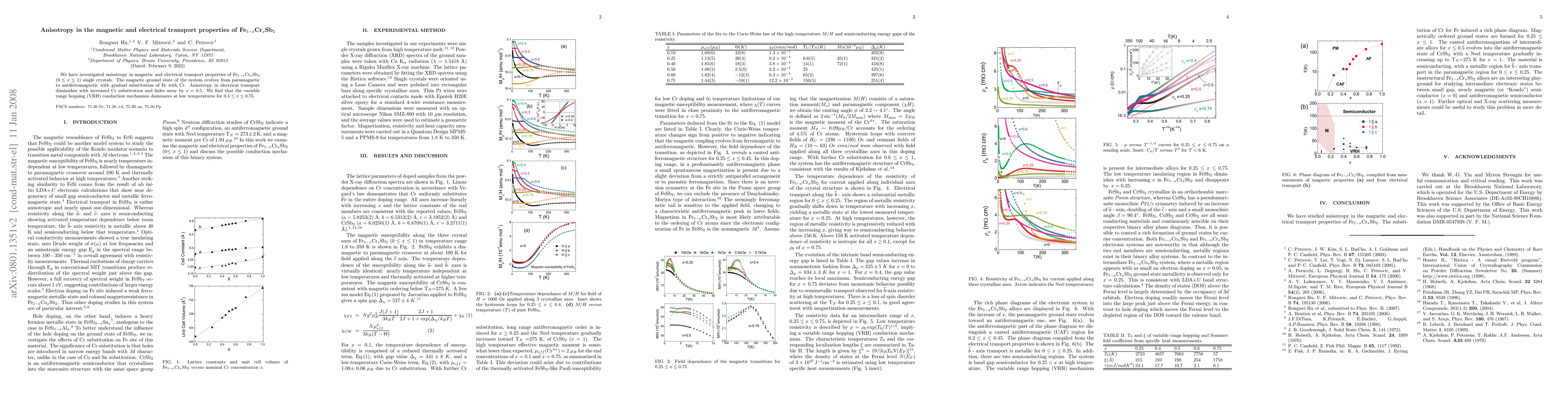 Summary: This study explores the anisotropy in magnetic and electrical transport properties of Fe1-xCrxSb2 single crystals, revealing a transition from paramagnetic to antiferromagnetic with Cr substitution, diminishing electrical anisotropy, and dominance of variable range hopping conduction at low temperatures for certain Cr concentrations.