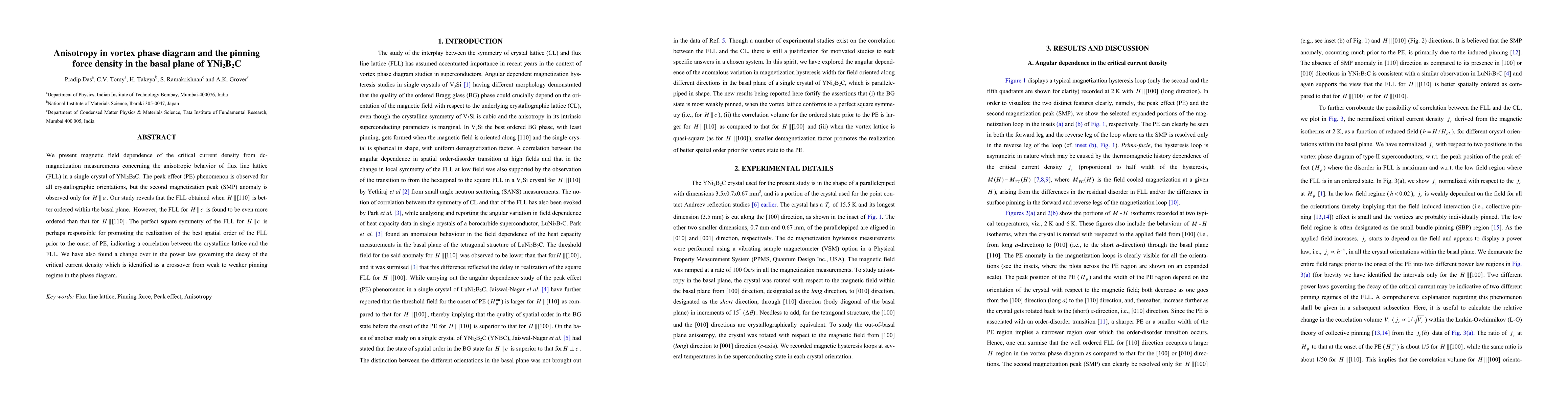 We present magnetic field dependence of the critical current density from dc-magnetization measurements concerning the anisotropic behavior of flux line lattice (FLL) in a single crystal of YNi_2B_2C. The peak effect (PE) phenomenon is observed for all crystallographic orientations, but the second magnetization peak (SMP) anomaly is observed only for H//a. Our study reveals that the FLL obtained when H//[100] is better ordered within the basal plane. However, the FLL for H// c is found to be even more ordered than that for H//[110]. The perfect square symmetry of the FLL for H//c is perhaps responsible for promoting the realization of the best spatial order of the FLL prior to the onset of PE, indicating a correlation between the crystalline lattice and the FLL. We have also found a change over in the power law governing the decay of the critical current density which is identified as a crossover from weak to weaker pinning regime in the phase diagram.