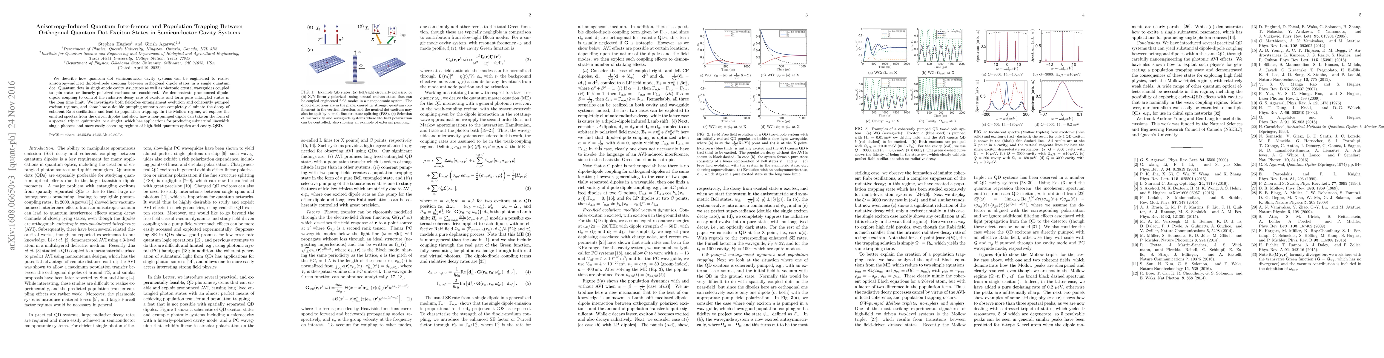 This paper explores anisotropy-induced quantum interference and population trapping in quantum dot semiconductor cavity systems, demonstrating dipole-dipole coupling to control exciton radiative decay and create entangled states. It also investigates the effects of double pumping to eliminate decay and achieve population trapping, leading to potential applications in generating single photons and enhancing quantum optics.