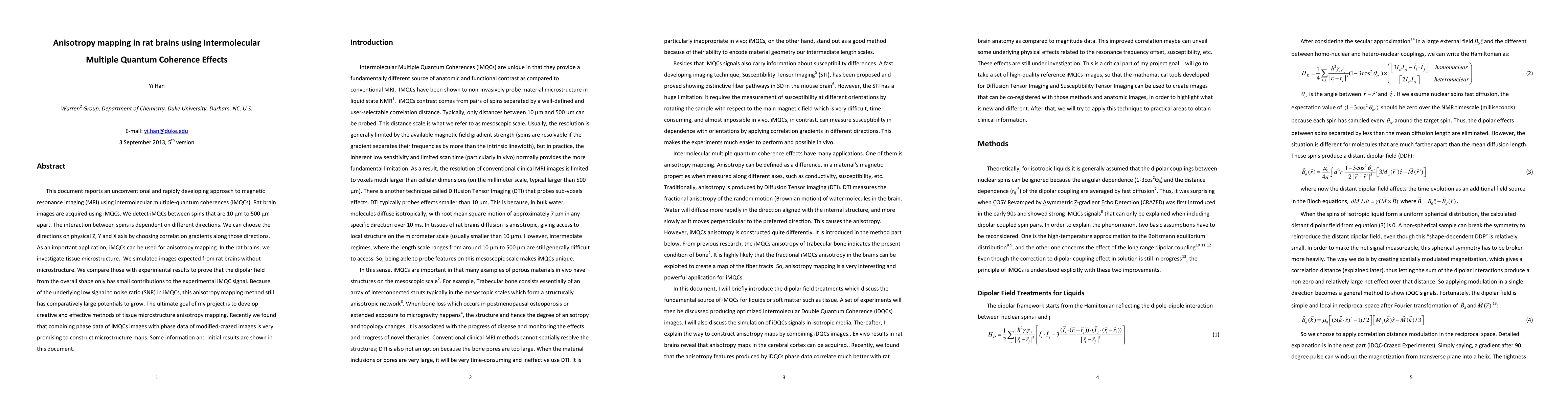 This document reports an unconventional and rapidly developing approach to magnetic resonance imaging (MRI) using intermolecular multiple-quantum coherences (iMQCs). Rat brain images are acquired using iMQCs. We detect iMQCs between spins that are 10 {\mu}m to 500 {\mu}m apart. The interaction between spins is dependent on different directions. We can choose the directions on physical Z, Y and X axis by choosing correlation gradients along those directions. As an important application, iMQCs can be used for anisotropy mapping. In the rat brains, we investigate tissue microstructure. We simulated images expected from rat brains without microstructure. We compare those with experimental results to prove that the dipolar field from the overall shape only has small contributions to the experimental iMQC signal. Because of the underlying low signal to noise ratio (SNR) in iMQCs, this anisotropy mapping method still has comparatively large potentials to grow. The ultimate goal of my project is to develop creative and effective methods of tissue microstructure anisotropy mapping. Recently we found that combining phase data of iMQCs images with phase data of modified-crazed images is very promising to construct microstructure maps. Some information and initial results are shown in this document.