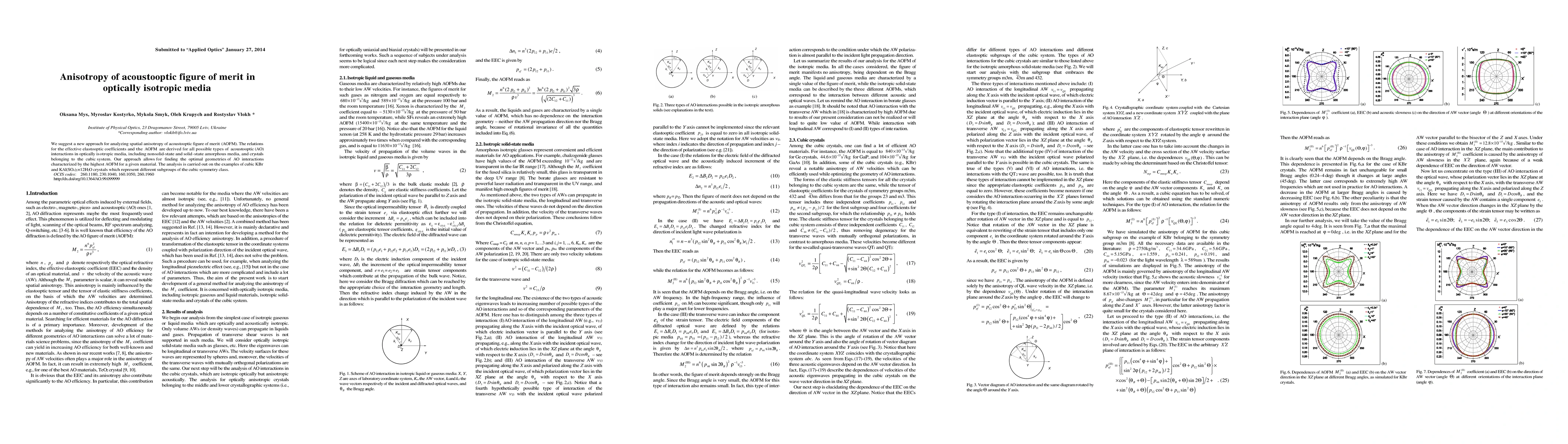 This paper proposes a new method to analyze the spatial anisotropy of the acoustooptic figure of merit in optically isotropic media, deriving relations for effective elastooptic coefficients and AOFM for various AO interactions. It identifies optimal geometries for high AOFM in materials like cubic KBr and KAl(SO4)2x12H2O crystals.