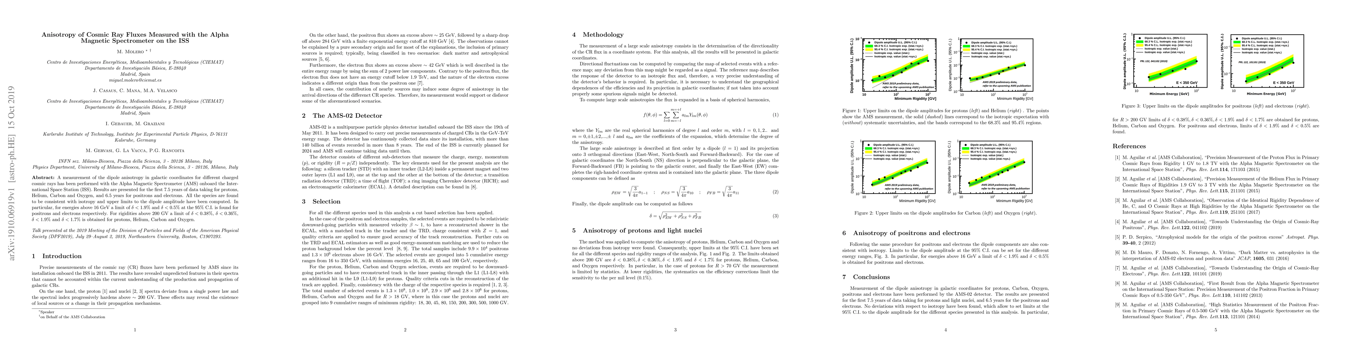 The Alpha Magnetic Spectrometer on the ISS measured the dipole anisotropy of cosmic rays for protons, Helium, Carbon, Oxygen, positrons, and electrons over 7.5 and 6.5 years respectively. Results indicate no significant anisotropy, establishing upper limits for dipole amplitude at high energies and rigidities.