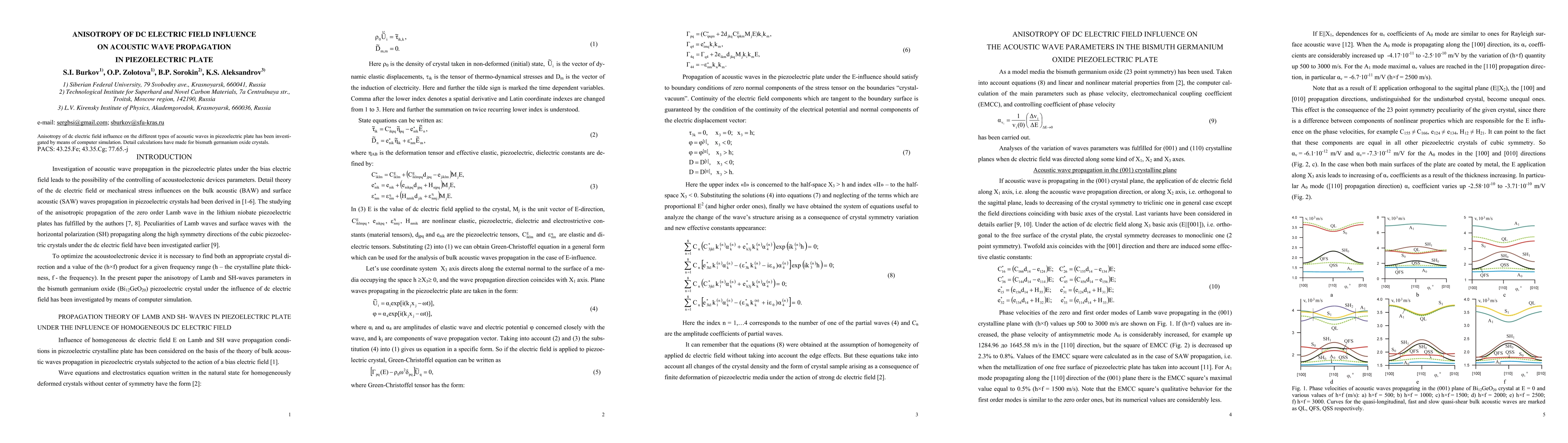 Summary: This study investigates the impact of anisotropic dc electric fields on various acoustic waves in piezoelectric plates, specifically focusing on bismuth germanium oxide crystals through detailed computer simulations. The findings highlight the distinct effects on wave propagation due to the electric field's anisotropy.