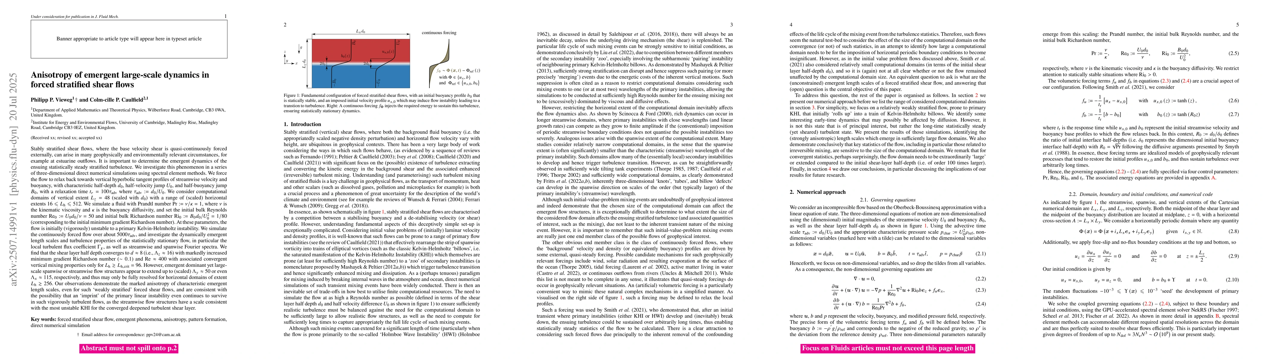 Stably stratified shear flows, where the base velocity shear is quasi-continuously forced externally, can arise in many geophysically relevant circumstances. It is important to determine the emergent dynamics of the ensuing statistically steady stratified turbulence. We investigate this phenomenon in a series of three-dimensional direct numerical simulations using spectral element methods. We force the flow to relax back towards vertical hyperbolic tangent profiles of streamwise velocity and buoyancy, with characteristic half-depth $\dO$, half-velocity jump $\UO$, and half-buoyancy jump $\BO$, with a relaxation time $t_r=100 \tauadv$ where $\tauadv:=\dO/\UO$. We consider computational domains of vertical extent $\Gz=48$ with a range of horizontal extents $16\leq\Gh\leq512$. We simulate a fluid with Prandtl number $\Pr:=\nu/\kappa=1$, and set the initial bulk Reynolds number $\ReO:=\UO\dO/\nu=50$ and Richardson number $\RiO:=\BO\dO/\UO^{2}=1/80$. At these parameters, the flow is initially unstable to a primary Kelvin-Helmholtz instability. We simulate the continuously forced flow over about $5000\tauadv$, and investigate the dynamically emergent length scales and turbulence properties of the statistically stationary flow, in particular the local turbulent flux coefficient. We find that the shear layer half depth converges to $d\approx8$ with markedly increased $\Re\approx400$ and associated convergent vertical mixing properties only for $\Gh\gtrsim\Ghcrit=96$. However, emergent dominant yet large-scale spanwise or streamwise flow structures appear to extend up to $\Lambda_{y}\approx50$ or even $\Lambda_{x}\approx115$, respectively. Our observations demonstrate the marked anisotropy of characteristic emergent length scales, and are consistent with the possibility that an `imprint' of the primary instability continues to survive in such turbulent flows.