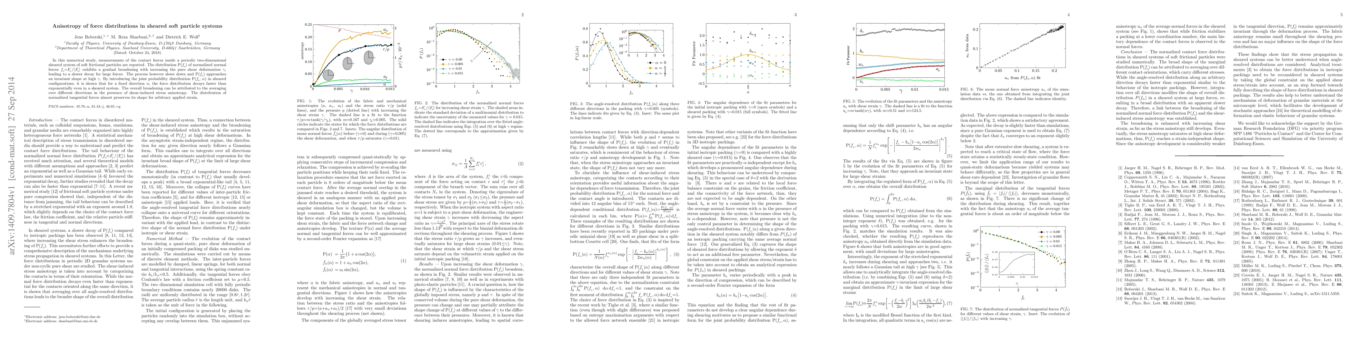This study investigates the anisotropy of force distributions in sheared soft particle systems, revealing that normal forces broaden gradually with increasing shear deformation but stabilize at high shear levels. Tangential forces maintain their shape regardless of applied strain, while the joint probability distribution shows a faster-than-exponential decay for forces in a fixed direction, influenced by shear-induced stress anisotropy.