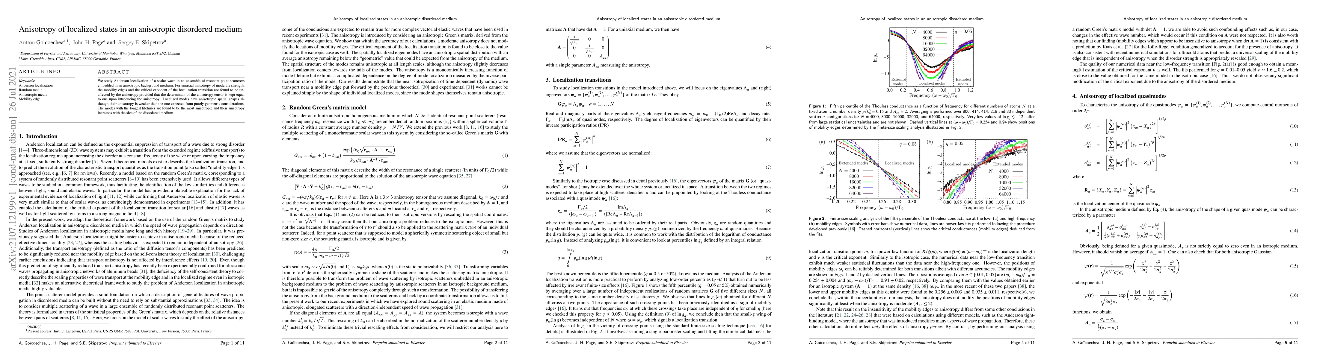 Researchers studied how anisotropy affects the behavior of localized states in a disordered medium with resonant point scatterers. They found that strong anisotropy can lead to anisotropic spatial shapes of localized modes, which become more pronounced as the size of the disordered medium increases.