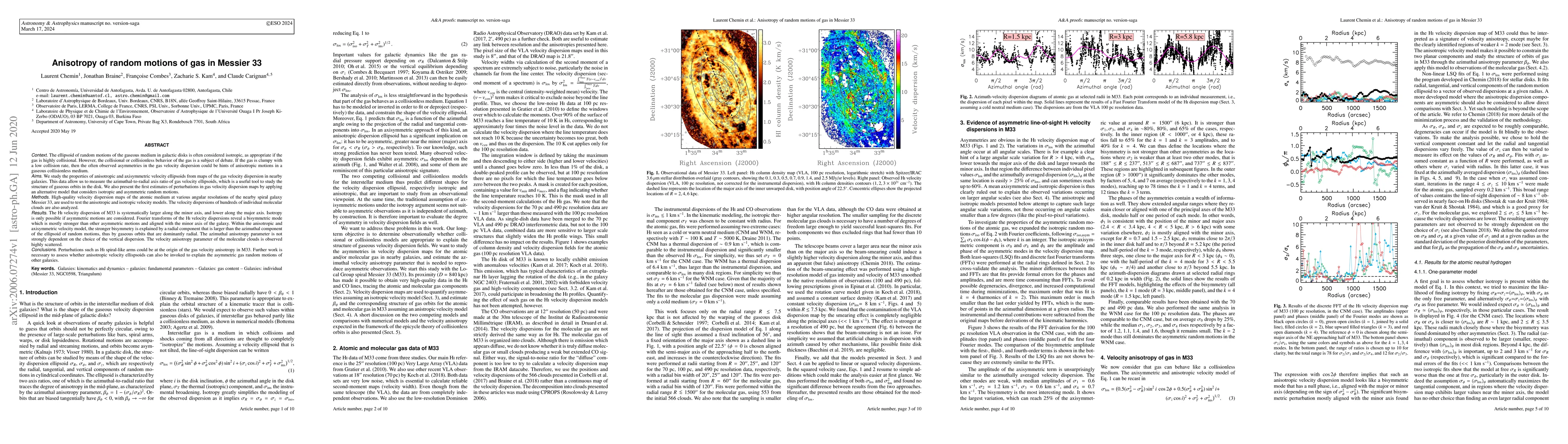 Researchers studied gas motion in the galaxy Messier 33, finding that gas velocity ellipsoids are more anisotropic along the minor axis, with radial motions dominating. The study suggests that spiral arms could be responsible for the observed anisotropy in gas random motions.