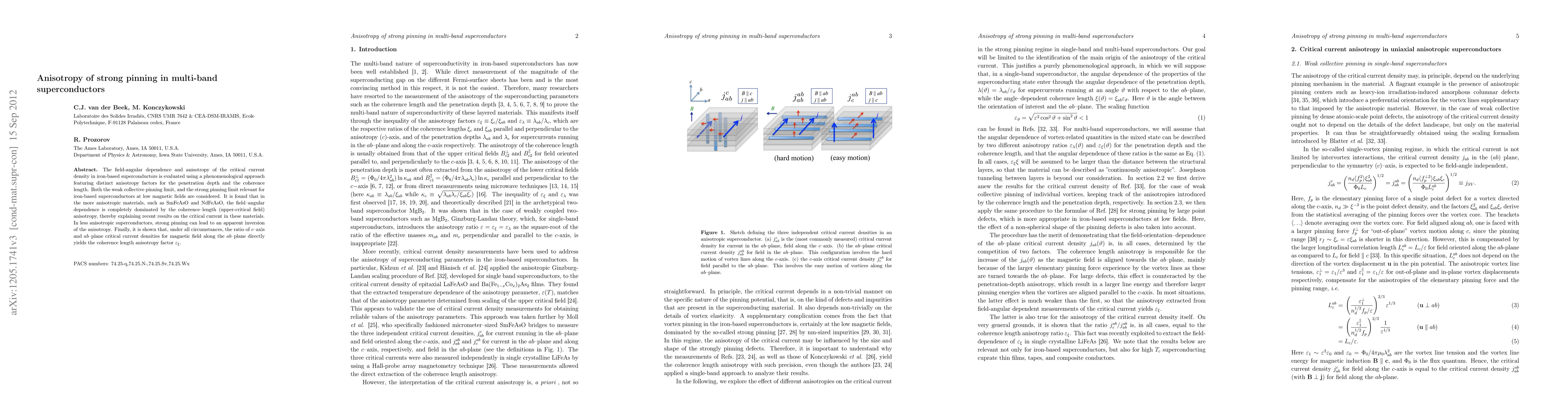 This study explores the anisotropy of strong pinning in multi-band superconductors, particularly iron-based ones, using a phenomenological approach. It reveals that in highly anisotropic materials, coherence-length anisotropy dominates the field-angular dependence, explaining recent critical current findings.