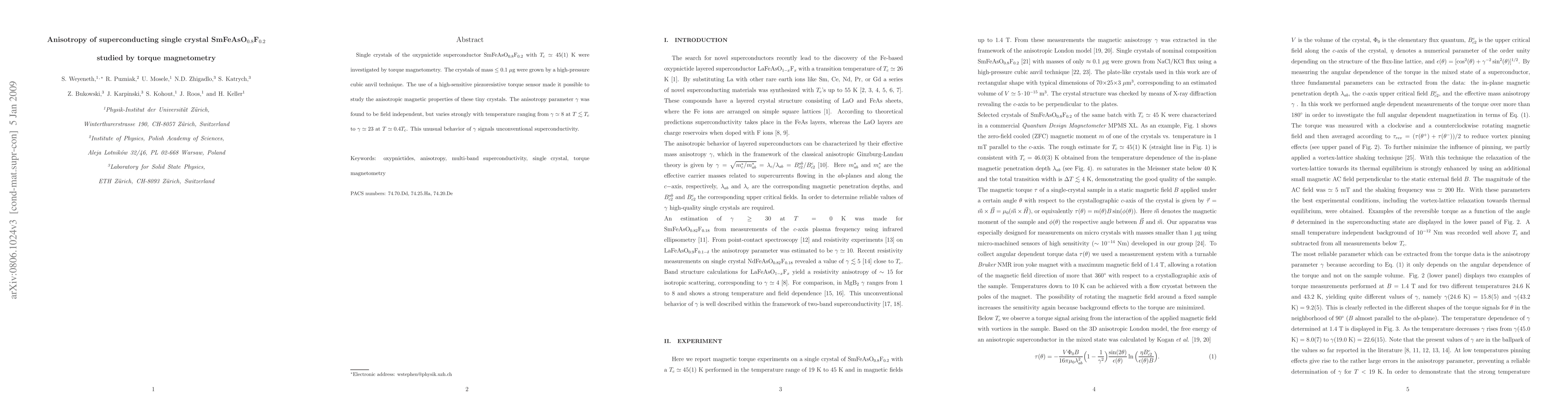 This study investigates the anisotropic magnetic properties of SmFeAsO_(0.8)F_(0.2) superconductors using torque magnetometry, revealing an unusual temperature-dependent anisotropy parameter indicative of unconventional superconductivity. The findings suggest a significant anisotropy ranging from 8 at T_c to 23 at 0.4T_c, highlighting the material's unique superconducting behavior.