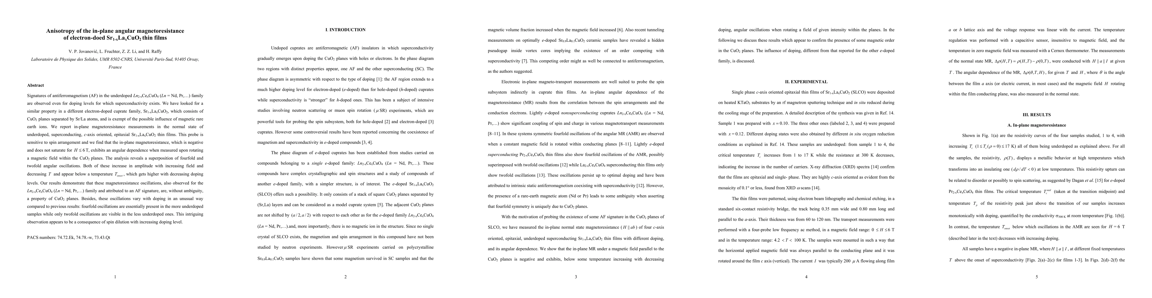 Signatures of antiferromagnetism (AF) in the underdoped Ln2-xCexCuO4 (Ln = Nd, Pr,...) family are observed even for doping levels for which superconductivity exists. We have looked for a similar property in a different electron-doped cuprate family, Sr1-xLaxCuO2, which consists of CuO2 planes separated by Sr/La atoms, and is exempt of the possible influence of magnetic rare earth ions. We report in-plane magnetoresistance measurements in the normal state of underdoped, superconducting, c-axis oriented, epitaxial Sr1-xLaxCuO2 thin films. This probe is sensitive to spin arrangement and we find that the in-plane magnetoresistance, which is negative and does not saturate for T, exhibits an angular dependence when measured upon rotating a magnetic field within the CuO2 planes. The analysis reveals a superposition of fourfold and twofold angular oscillations. Both of these increase in amplitude with increasing field and decreasing and appear below a temperature, which gets higher with decreasing doping levels. Our results demonstrate that these magnetoresistance oscillations, also observed for the Ln2-xCexCuO4 (Ln = Nd, Pr,...) family and attributed to an AF signature, are, without ambiguity, a property of CuO2 planes. Besides, these oscillations vary with doping in an unusual way compared to previous results: fourfold oscillations are essentially present in the more underdoped samples while only twofold oscillations are visible in the less underdoped ones. This intriguing observation appears to be a consequence of spin dilution with increasing doping level.