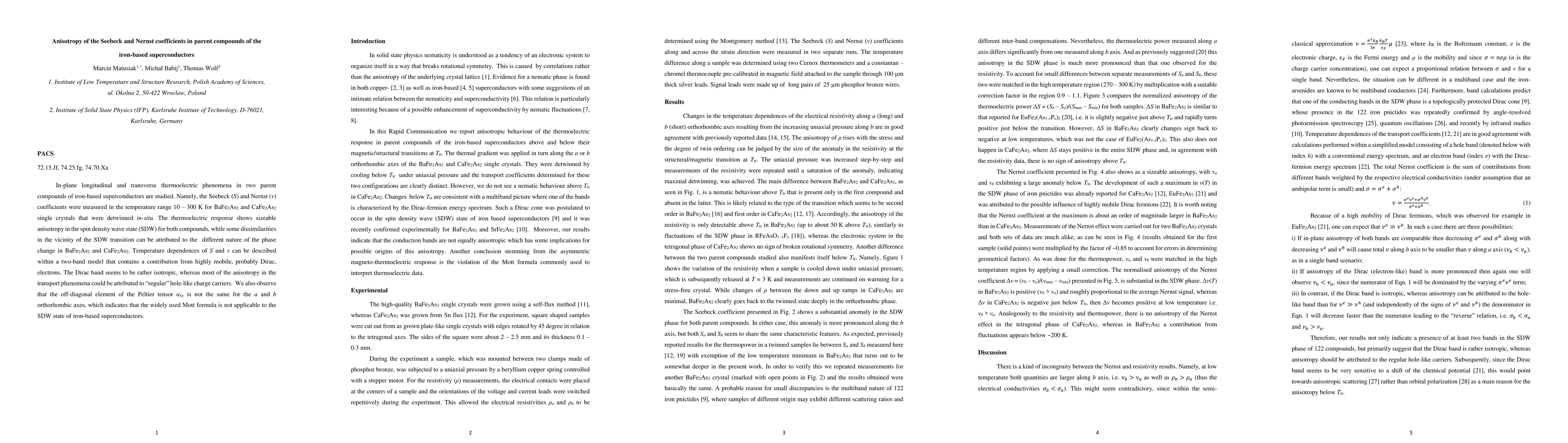 The study examines thermoelectric properties of BaFe2As2 and CaFe2As2, finding significant anisotropy in their Seebeck and Nernst coefficients within the spin density wave state. The response is described by a two-band model, indicating highly mobile, likely Dirac electrons, while most anisotropy originates from hole-like charge carriers. The research also reveals that the Mott formula isn't applicable to the SDW state of iron-based superconductors.