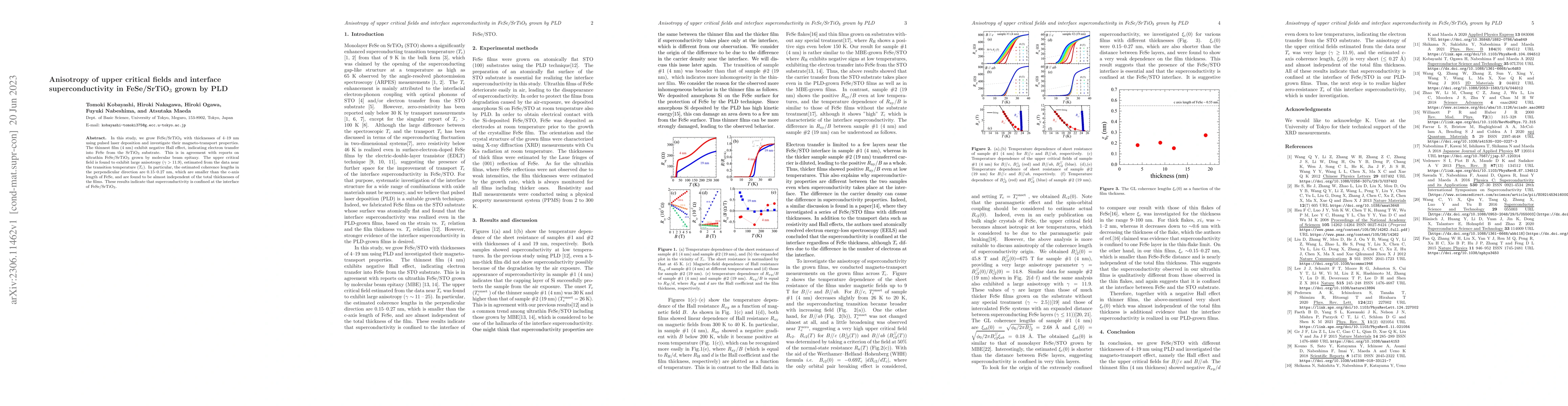 Detailed analysis of upper critical fields and their anisotropy in FeSe/SrTiO3 thin films grown by PLD, providing evidence for interface-confined superconductivity.