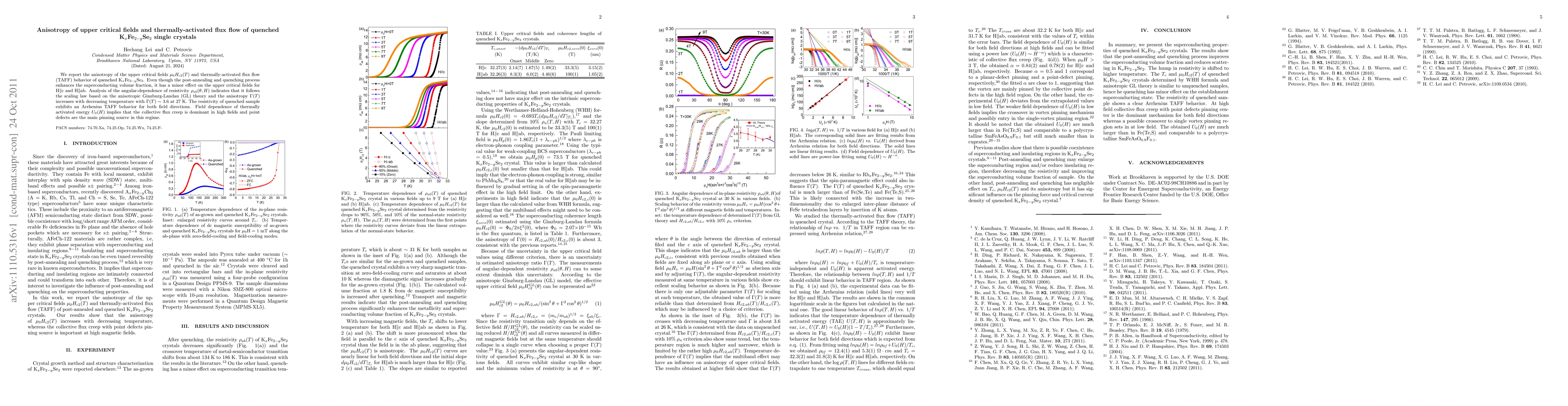 This study investigates the anisotropy of upper critical fields and thermally-activated flux flow in quenched KxFe2-ySe2 single crystals, revealing minor effects on Hc2 for different field orientations despite enhanced superconductivity. The analysis shows anisotropic Ginzburg-Landau behavior and dominant collective flux creep at high fields, indicating point defects as the primary pinning source.