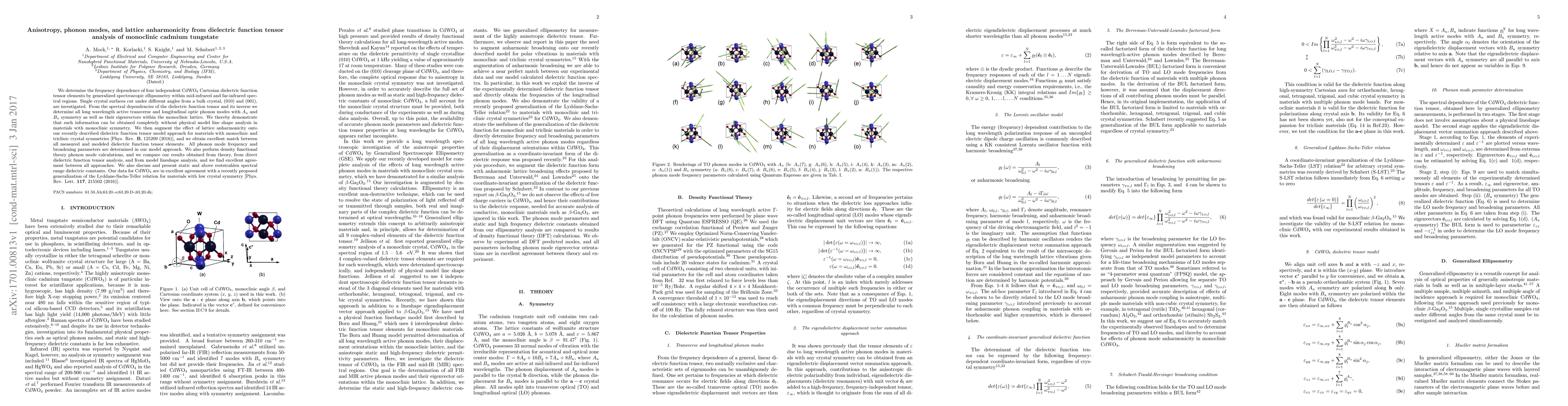 Researchers studied the properties of cadmium tungstate using dielectric function tensor analysis to determine phonon modes and lattice anharmonicity in monoclinic crystals, achieving excellent agreement with theoretical calculations and experimental data.