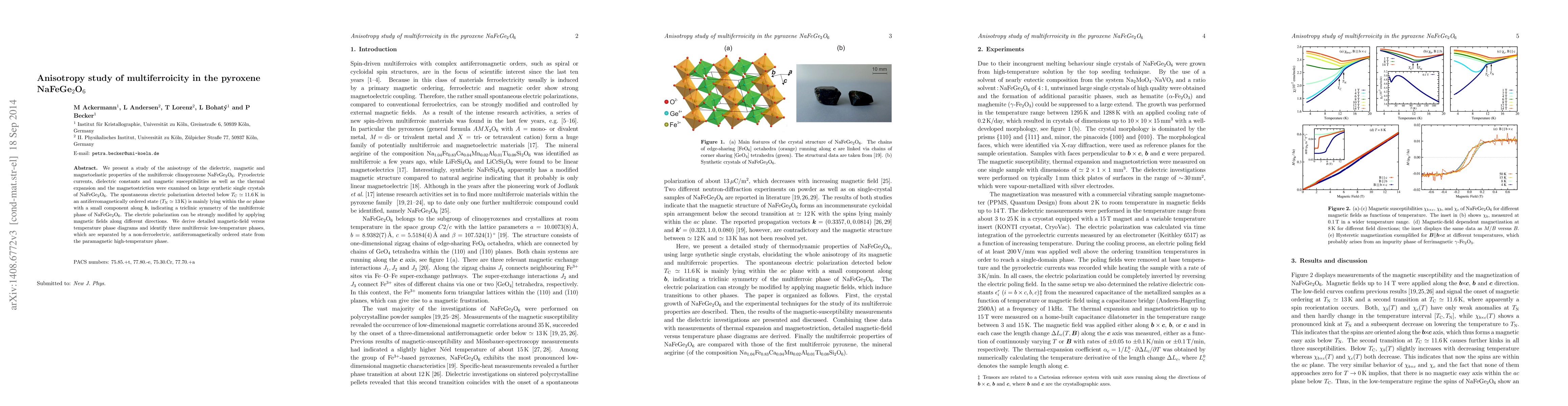 The study examines the multiferroic clinopyroxene NaFeGe2O6, revealing that its spontaneous electric polarization mainly lies within the ac plane with a small component along b, indicating triclinic symmetry. Three multiferroic phases are identified, distinguished by magnetic-field versus temperature phase diagrams, separating a non-ferroelectric, antiferromagnetically ordered state from the paramagnetic high-temperature phase.