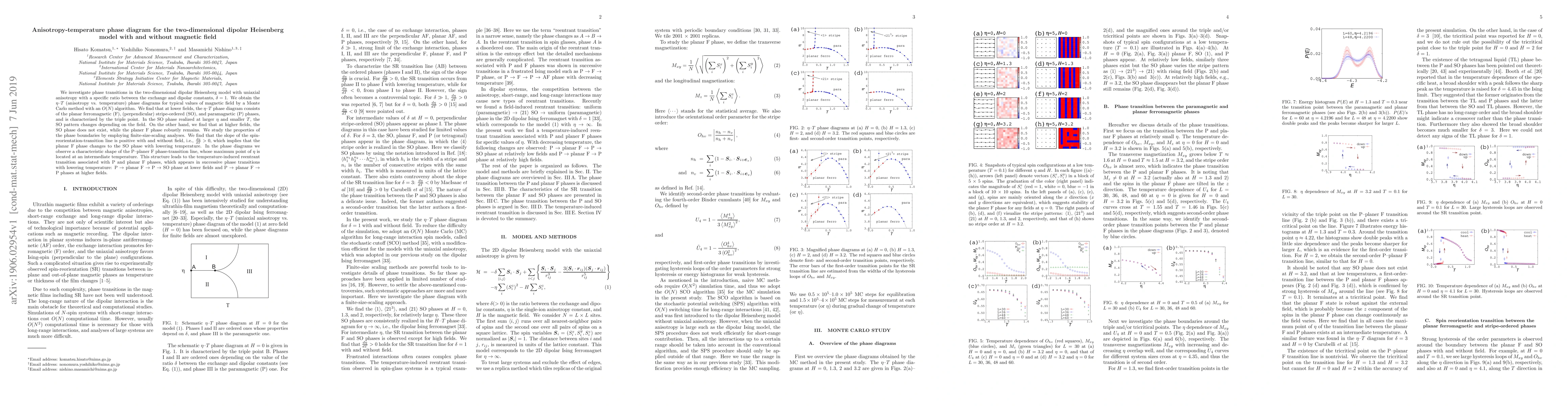 This paper investigates phase transitions in the two-dimensional dipolar Heisenberg model using Monte Carlo simulations, revealing distinct $\eta$--$T$ phase diagrams under different magnetic fields. At lower fields, it identifies a triple-point with planar F, SO, and P phases, while higher fields eliminate the SO phase, maintaining the planar F phase.