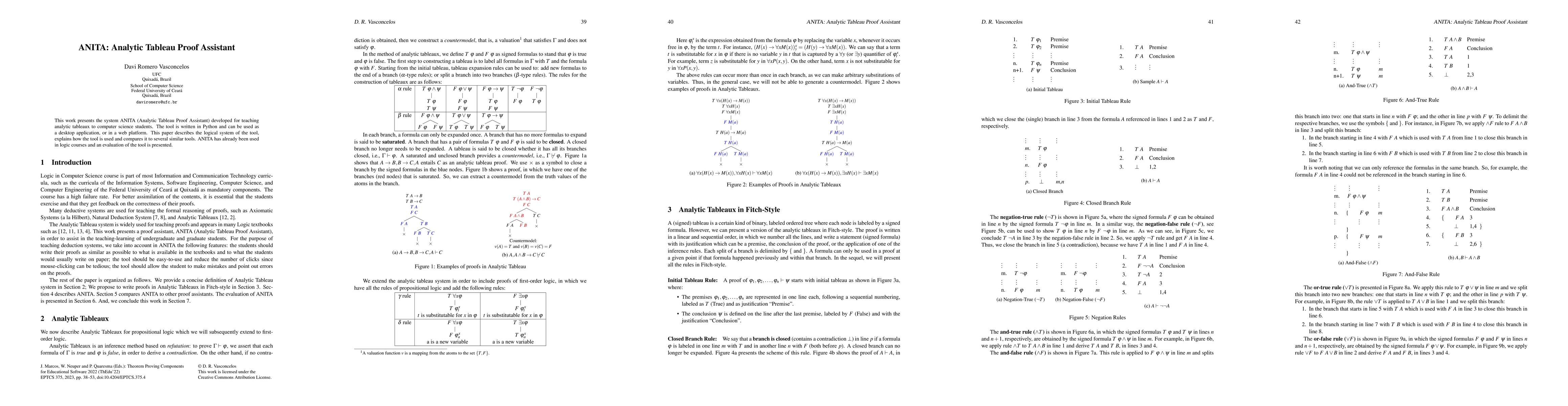 ANITA is a Python-based analytic tableau proof assistant designed for teaching logic to computer science students, available as a desktop or web application. The paper evaluates its effectiveness and compares it to other similar tools based on its logical system and usage.