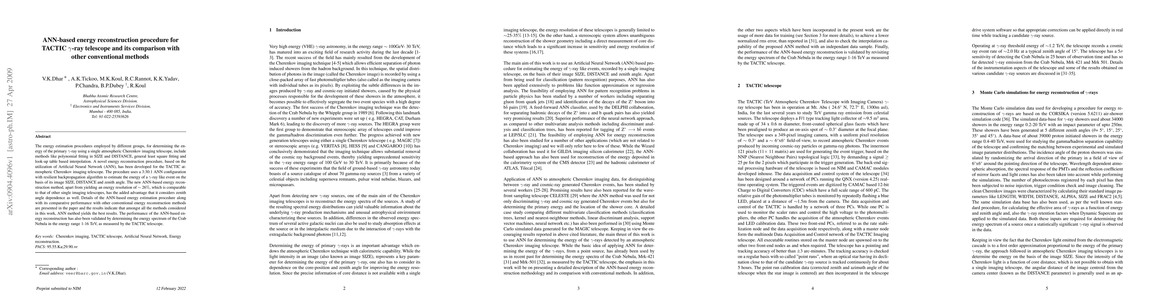 This paper introduces an Artificial Neural Network (ANN)-based energy reconstruction procedure for the TACTIC gamma-ray telescope, demonstrating its superior performance compared to conventional methods like polynomial fitting and look-up table interpolation. The ANN method achieves comparable energy resolution while considering zenith angle dependence, outperforming other techniques in the study.