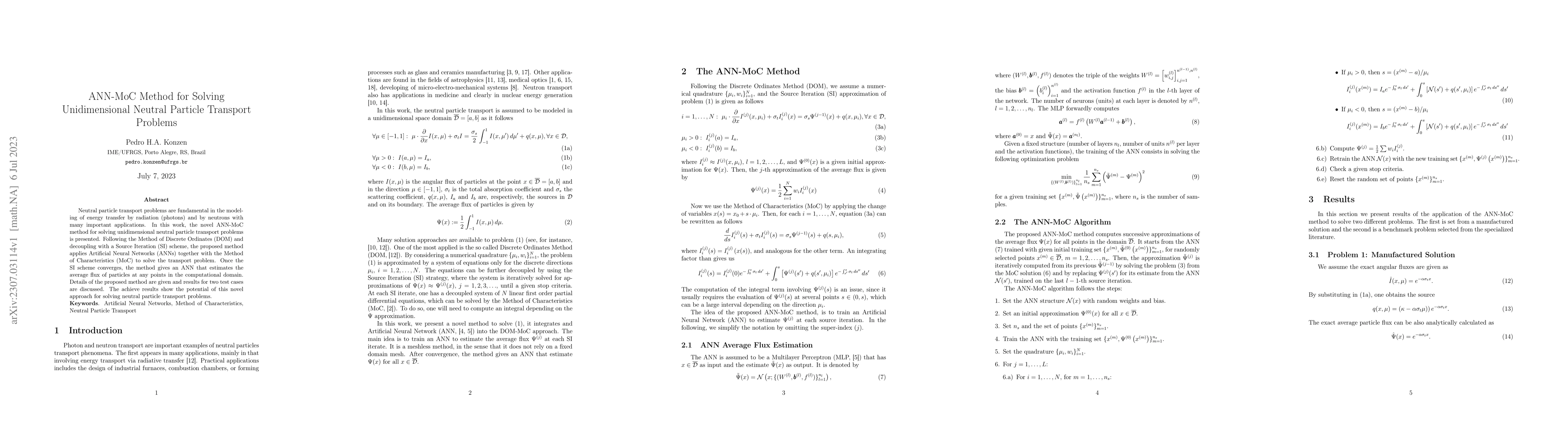 This paper introduces a novel ANN-MoC method combining Artificial Neural Networks and the Method of Characteristics to solve unidimensional neutral particle transport problems, achieving accurate flux estimations as demonstrated by test case results. The method integrates the Method of Discrete Ordinates and a Source Iteration scheme for effective decoupling and solution convergence.