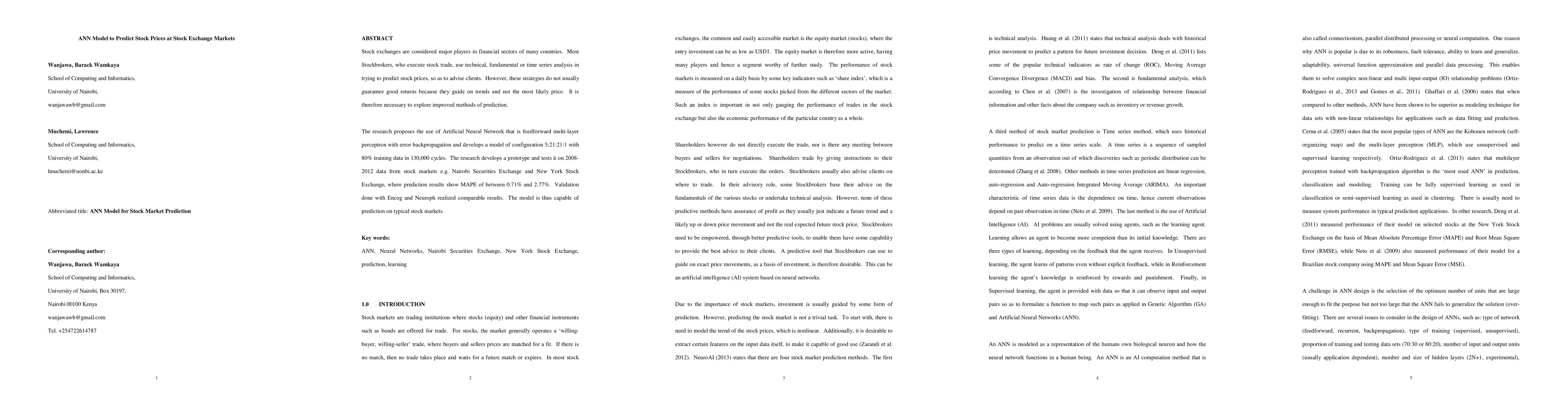Stock exchanges are considered major players in financial sectors of many countries. Most Stockbrokers, who execute stock trade, use technical, fundamental or time series analysis in trying to predict stock prices, so as to advise clients. However, these strategies do not usually guarantee good returns because they guide on trends and not the most likely price. It is therefore necessary to explore improved methods of prediction. The research proposes the use of Artificial Neural Network that is feedforward multi-layer perceptron with error backpropagation and develops a model of configuration 5:21:21:1 with 80% training data in 130,000 cycles. The research develops a prototype and tests it on 2008-2012 data from stock markets e.g. Nairobi Securities Exchange and New York Stock Exchange, where prediction results show MAPE of between 0.71% and 2.77%. Validation done with Encog and Neuroph realized comparable results. The model is thus capable of prediction on typical stock markets.