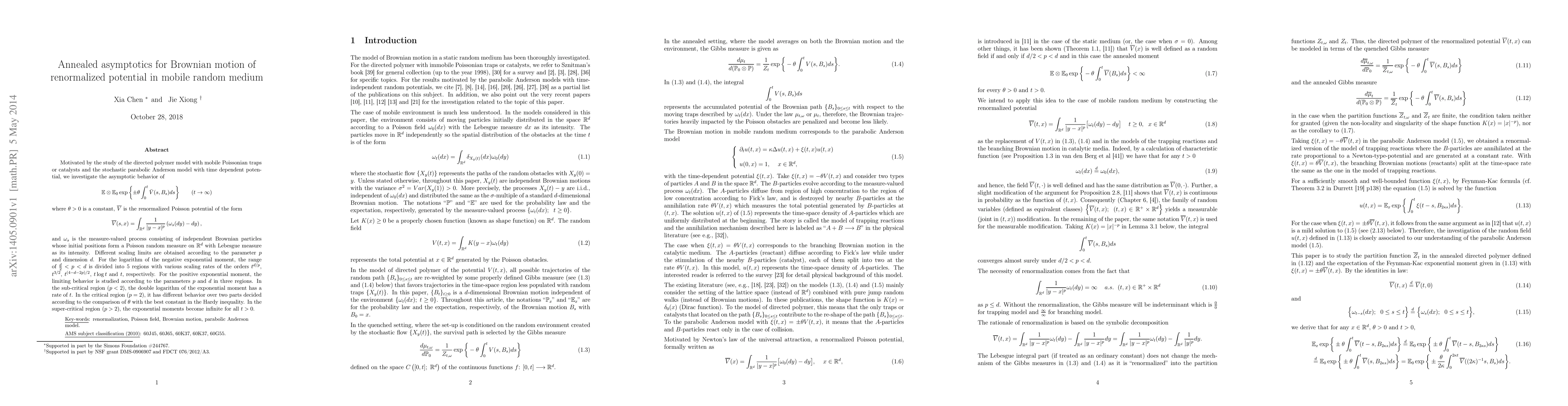 This paper studies the annealed asymptotics of Brownian motion in a mobile random medium, focusing on the renormalized potential of Poissonian traps. It analyzes the scaling limits for different values of the parameter \( p \) and dimension \( d \), identifying distinct regions and scaling rates for both the negative and positive exponential moments.