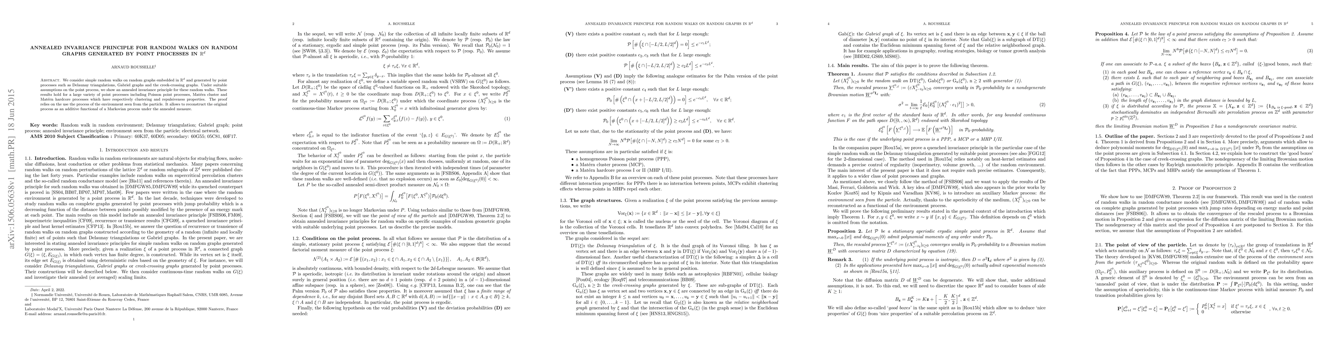 Summary: The paper establishes an annealed invariance principle for random walks on random graphs generated by various point processes in $\mathbb{R}^d$. The proof leverages the environment seen from the particle to reconstruct the original process as an additive functional of a Markovian process.