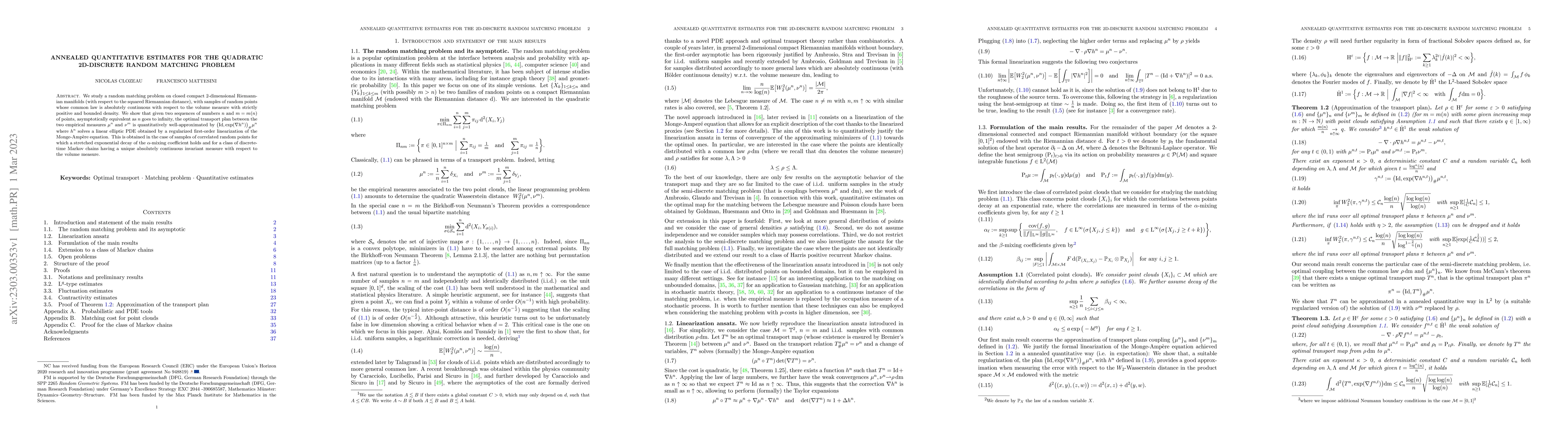 This paper investigates the quadratic 2D-discrete random matching problem on Riemannian manifolds, demonstrating that the optimal transport plan between two empirical measures is quantitatively approximated by a specific transformation involving the solution of a linear elliptic PDE derived from the Monge-Ampère equation. The results apply to correlated random points and Markov chains with unique invariant measures.
