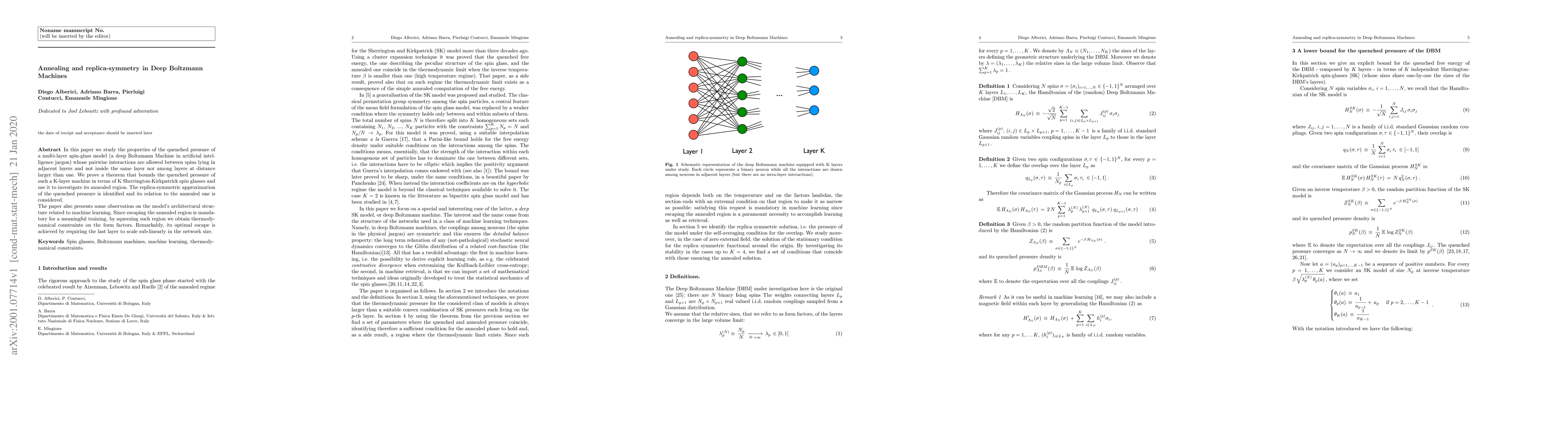 In this paper we study the properties of the quenched pressure of a multi-layer spin-glass model (a deep Boltzmann Machine in artificial intelligence jargon) whose pairwise interactions are allowed between spins lying in adjacent layers and not inside the same layer nor among layers at distance larger than one. We prove a theorem that bounds the quenched pressure of such a K-layer machine in terms of K Sherrington-Kirkpatrick spin glasses and use it to investigate its annealed region. The replica-symmetric approximation of the quenched pressure is identified and its relation to the annealed one is considered. The paper also presents some observation on the model's architectural structure related to machine learning. Since escaping the annealed region is mandatory for a meaningful training, by squeezing such region we obtain thermodynamical constraints on the form factors. Remarkably, its optimal escape is achieved by requiring the last layer to scale sub-linearly in the network size.