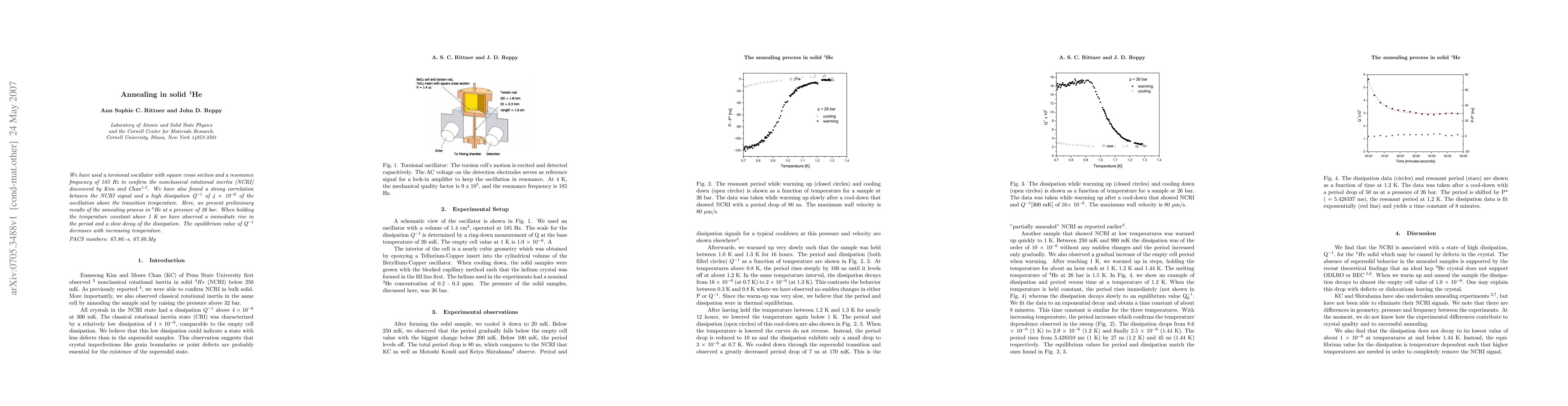 We have used a torsional oscillator with square cross section and a resonance frequency of 185 Hz to confirm the nonclassical rotational inertia (NCRI) discovered by Kim and Chan\cite{1,2}. We have also found a strong correlation between the NCRI signal and a high dissipation Q$^{-1}$ of 4 $\times$ 10$^{-6}$ of the oscillation above the transition temperature. Here, we present preliminary results of the annealing process in $^{4}$He at a pressure of 26 bar. When holding the temperature constant above 1 K we have observed a immediate rise in the period and a slow decay of the dissipation. The equilibrium value of Q$^{-1}$ decreases with increasing temperature.