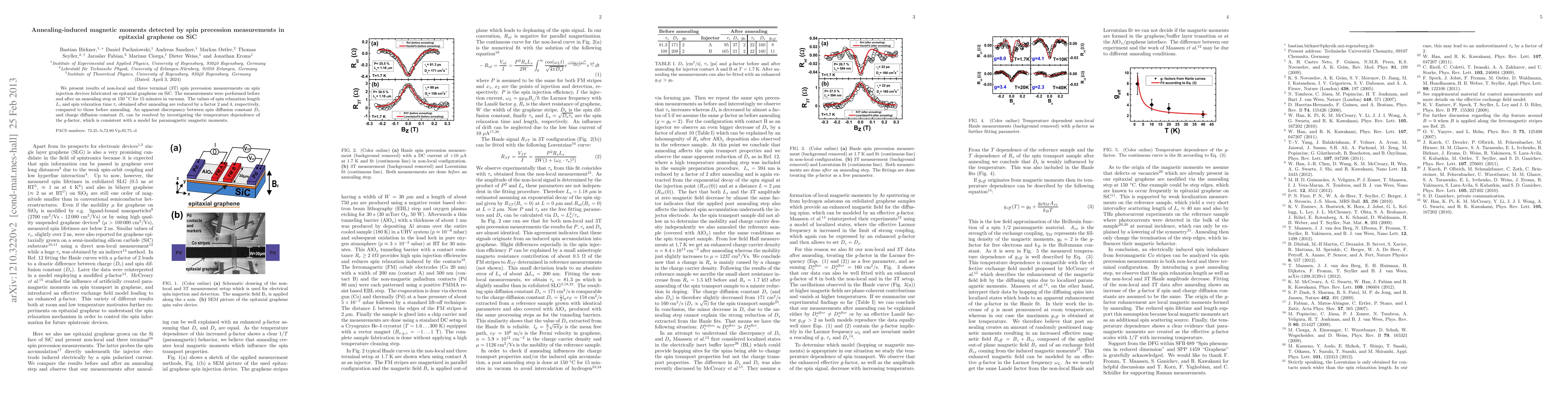 We present results of non-local and three terminal (3T) spin precession measurements on spin injection devices fabricated on epitaxial graphene on SiC. The measurements were performed before and after an annealing step at 150 degrees Celsius for 15 minutes in vacuum. The values of spin relaxation length L_s and spin relaxation time tau_s obtained after annealing are reduced by a factor 2 and 4, respectively, compared to those before annealing. An apparent discrepancy between spin diffusion constant D_s and charge diffusion constant D_c can be resolved by investigating the temperature dependence of the g-factor, which is consistent with a model for paramagnetic magnetic moments.