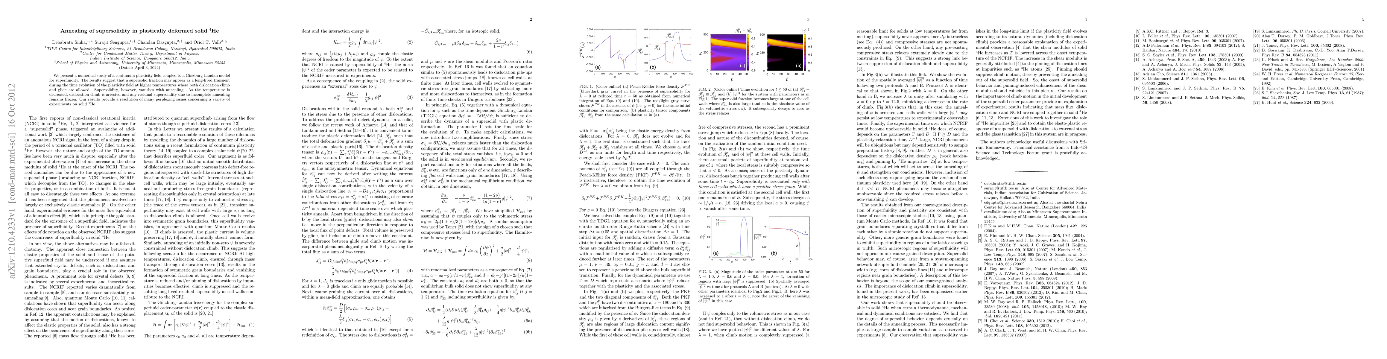 We present a numerical study of a continuum plasticity field coupled to a Ginzburg-Landau model for superfluidity. The results suggest that a supersolid fraction may appear as a long-lived transient during the time evolution of the plasticity field at higher temperatures where both dislocation climb and glide are allowed. Supersolidity, however, vanishes with annealing. As the temperature is decreased, dislocation climb is arrested and any residual supersolidity due to incomplete annealing remains frozen. Our results provide a resolution of many perplexing issues concerning a variety of experiments on solid $^4$He.