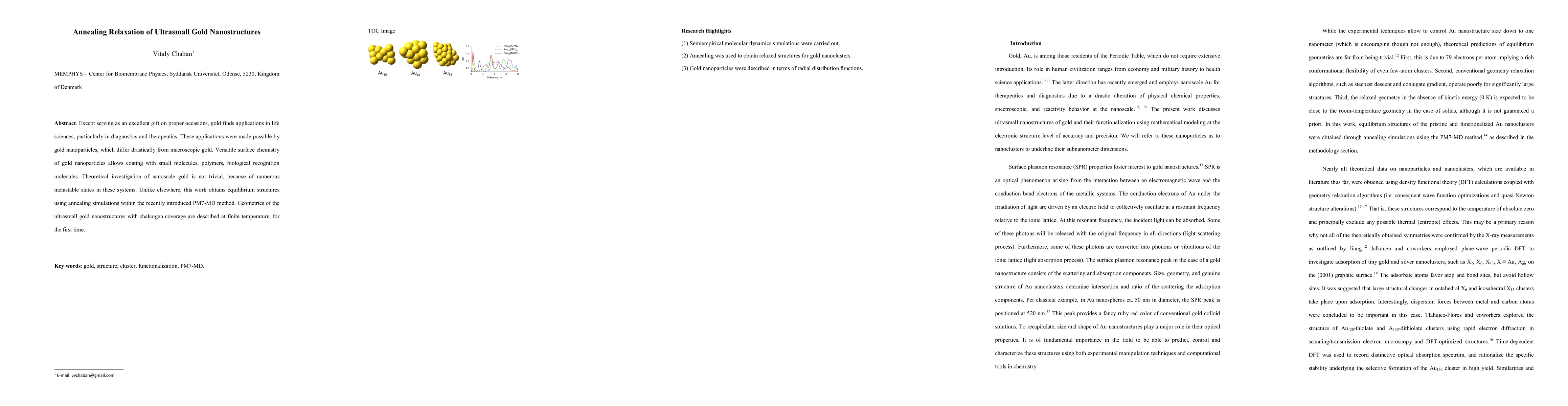 This paper investigates the annealing relaxation of ultrasmall gold nanostructures using the PM7-MD method, revealing equilibrium geometries at finite temperatures for the first time. The study focuses on the metastable states of nanoscale gold, crucial for its applications in diagnostics and therapeutics.