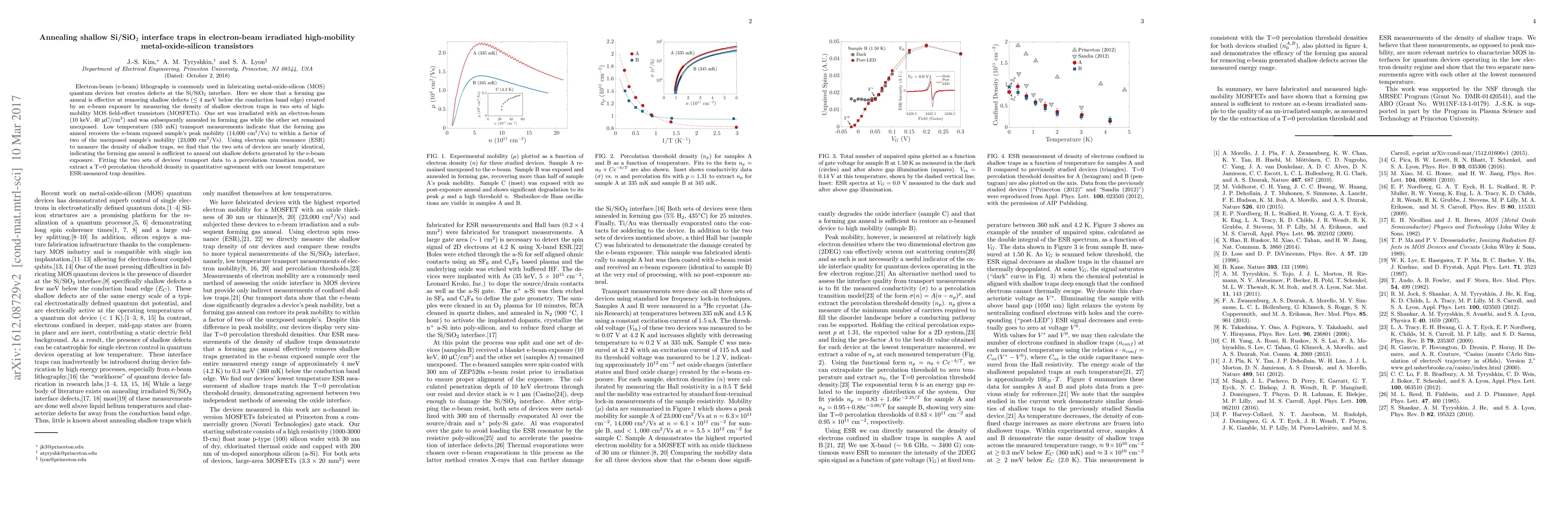 Electron-beam (e-beam) lithography is commonly used in fabricating metal-oxide-silicon (MOS) quantum devices but creates defects at the Si/SiO$_2$ interface. Here we show that a forming gas anneal is effective at removing shallow defects ($\leq$ 4 meV below the conduction band edge) created by an e-beam exposure by measuring the density of shallow electron traps in two sets of high-mobility MOS field-effect transistors (MOSFETs). One set was irradiated with an electron-beam (10 keV, 40 $\mu$C/cm$^2$) and was subsequently annealed in forming gas while the other set remained unexposed. Low temperature (335 mK) transport measurements indicate that the forming gas anneal recovers the e-beam exposed sample's peak mobility (14,000 cm$^2$/Vs) to within a factor of two of the unexposed sample's mobility (23,000 cm$^2$/Vs). Using electron spin resonance (ESR) to measure the density of shallow traps, we find that the two sets of devices are nearly identical, indicating the forming gas anneal is sufficient to anneal out shallow defects generated by the e-beam exposure. Fitting the two sets of devices' transport data to a percolation transition model, we extract a T=0 percolation threshold density in quantitative agreement with our lowest temperature ESR-measured trap densities.