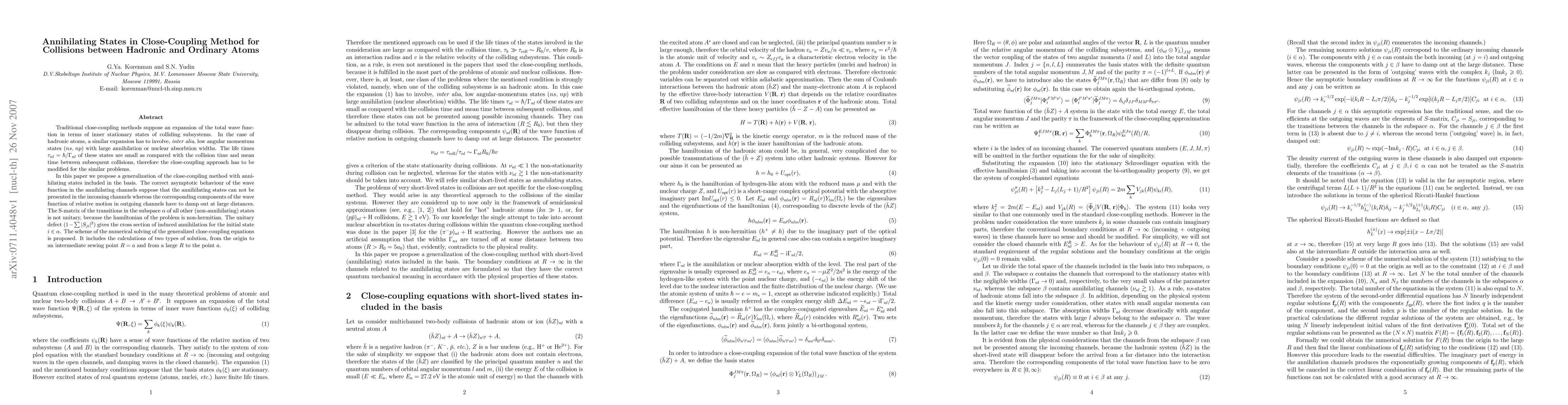 Traditional close-coupling methods suppose an expansion of the total wave function in terms of inner stationary states of colliding subsystems. In the case of hadronic atoms, a similar expansion has to involve, \emph{inter alia}, low angular momentum states (ns, np) with large annihilation or nuclear absorbtion widths. The life times of these states are small as compared with the collision time and mean time between subsequent collisions, therefore the close-coupling approach has to be modified for the similar problems. In this paper we propose a generalization of the close-coupling method with annihilating states included in the basis. The correct asymptotic behaviour of the wave function in the annihilating channels suppose that the annihilating states can not be presented in the incoming channels whereas the corresponding components of the wave function of relative motion in outgoing channels have to damp out at large distances. The S-matrix of the transitions in the subspace of all other (non-annihilating) states is not unitary, because the hamiltonian of the problem is non-hermitian. The unitary defect gives the cross section of induced annihilation. The scheme of the numerical solving of the generalized close-coupling equations is proposed. It includes the calculations of two types of solution, from the origin to an intermediate sewing point R=a and from a large R to the point a.