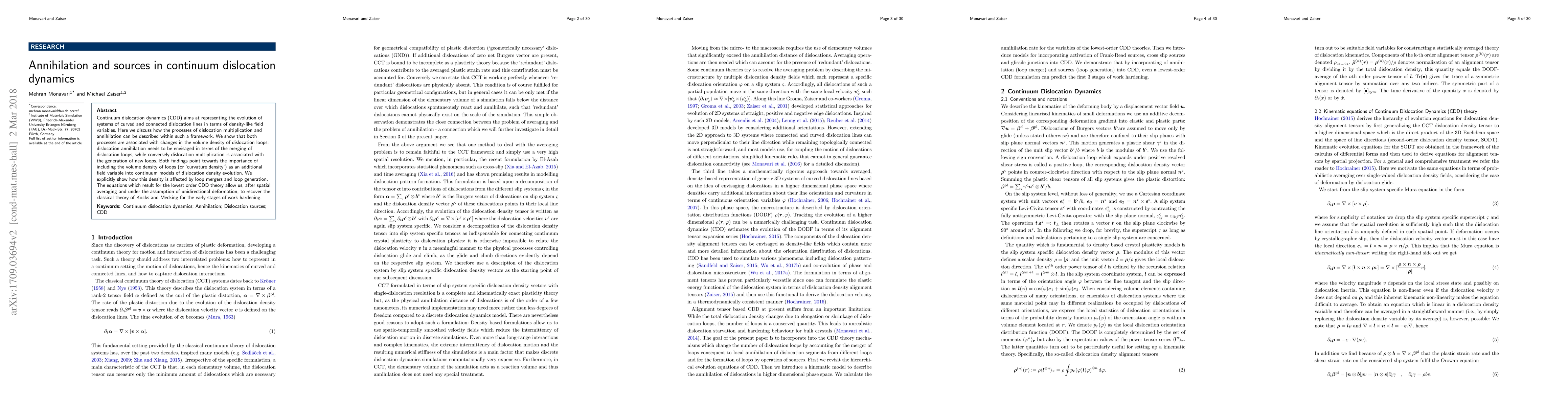 This paper explores continuum dislocation dynamics (CDD) to describe the evolution of dislocation systems, emphasizing the processes of dislocation multiplication and annihilation. It highlights the importance of incorporating the volume density of dislocation loops, or 'curvature density,' as an additional field variable in CDD models, and shows how this density changes with loop mergers and generation, ultimately recovering classical work hardening theories.