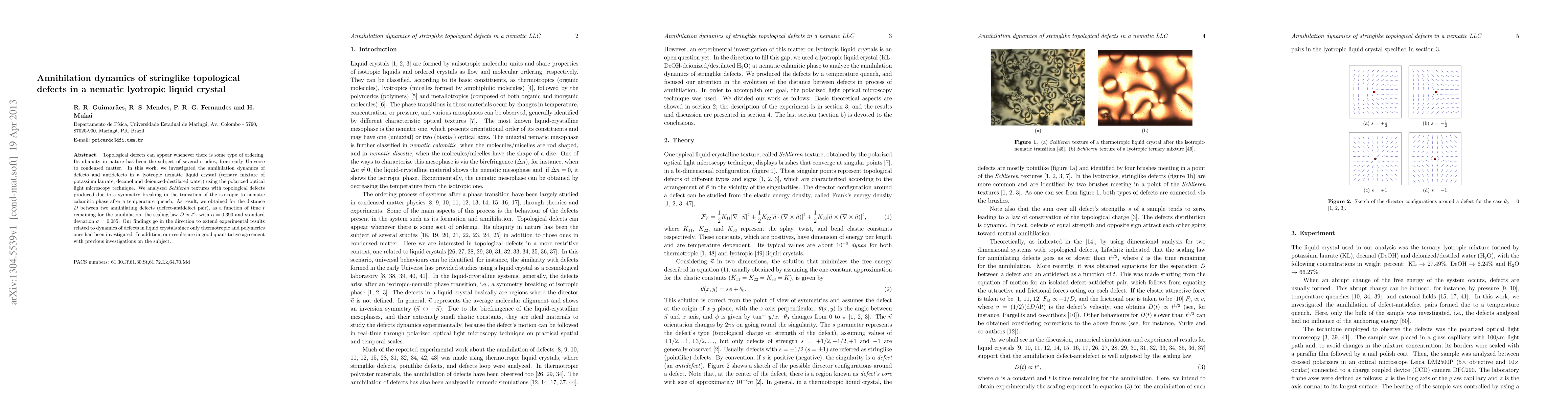 This study investigates the annihilation dynamics of topological defects in a lyotropic nematic liquid crystal using polarized optical microscopy. The research reveals a scaling law D ~ t^{0.390} for the distance between annihilating defects, extending experimental findings to lyotropic systems and aligning with previous studies on thermotropic defects.