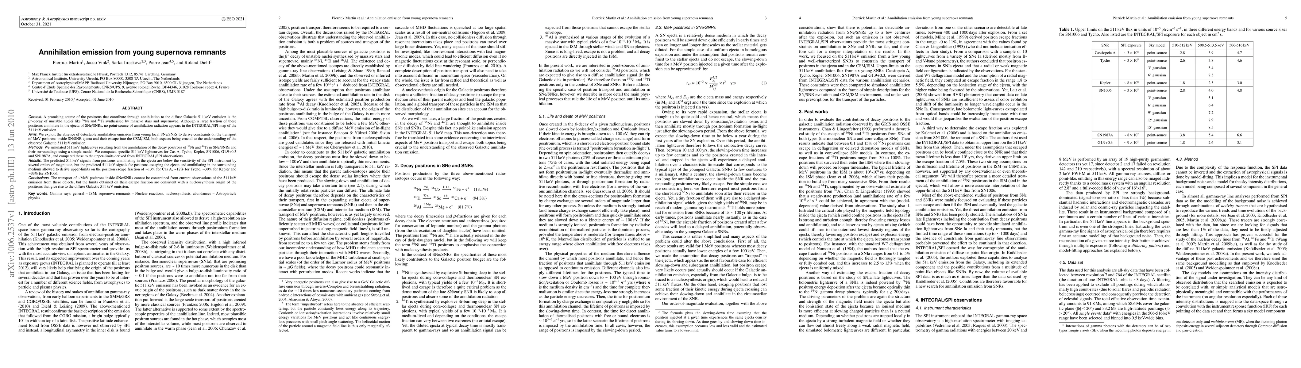 A promising source of the positrons that contribute through annihilation to the diffuse Galactic 511keV emission is the beta-decay of unstable nuclei like 56Ni and 44Ti synthesised by massive stars and supernovae. Although a large fraction of these positrons annihilate in the ejecta of SNe/SNRs, no point-source of annihilation radiation appears in the INTEGRAL/SPI map of the 511keV emission. We exploit the absence of detectable annihilation emission from young local SNe/SNRs to derive constraints on the transport of MeV positrons inside SN/SNR ejecta and their escape into the CSM/ISM, both aspects being crucial to the understanding of the observed Galactic 511keV emission. We simulated 511keV lightcurves resulting from the annihilation of the decay positrons of 56Ni and 44Ti in SNe/SNRs and their surroundings using a simple model. We computed specific 511keV lightcurves for Cas A, Tycho, Kepler, SN1006, G1.9+0.3 and SN1987A, and compared these to the upper-limits derived from INTEGRAL/SPI observations. The predicted 511keV signals from positrons annihilating in the ejecta are below the sensitivity of the SPI instrument by several orders of magnitude, but the predicted 511keV signals for positrons escaping the ejecta and annihilating in the surrounding medium allowed to derive upper-limits on the positron escape fraction of ~13% for Cas A, ~12% for Tycho, ~30% for Kepler and ~33% for SN1006. The transport of ~MeV positrons inside SNe/SNRs cannot be constrained from current observations of the 511keV emission from these objects, but the limits obtained on their escape fraction are consistent with a nucleosynthesis origin of the positrons that give rise to the diffuse Galactic 511keV emission.