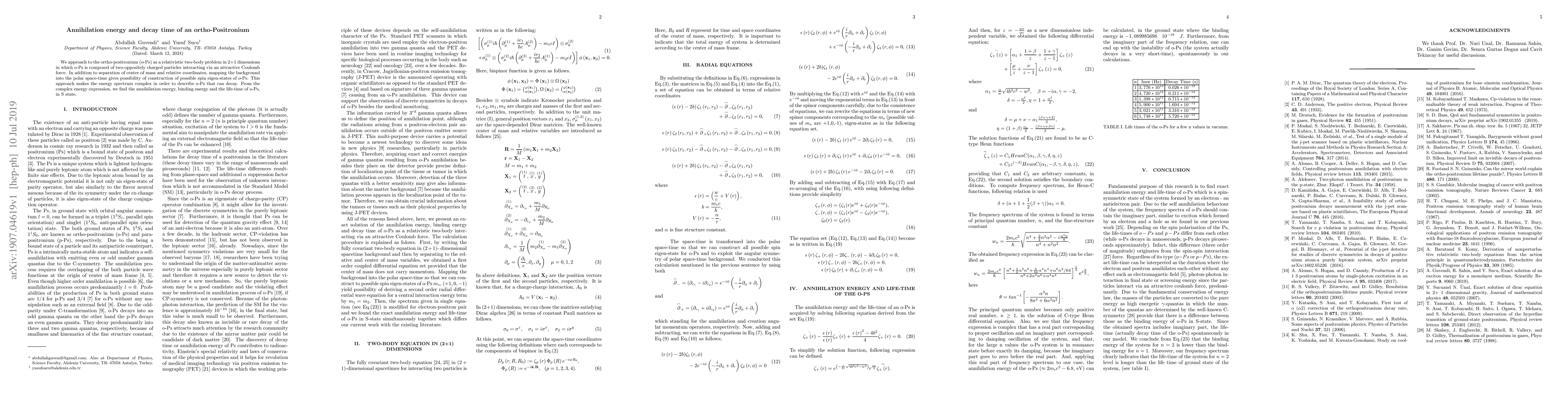 We approach to the ortho-positronium (o-Ps) as a relativistic two-body problem in $2+1$ dimensions in which o-Ps is composed of two-oppositely charged particles interacting via an attractive Coulomb force. In addition to separation of center of mass and relative coordinates, mapping the background into the polar space-time gives possibility of construction of possible spin eigen-states of o-Ps. This approach makes the energy spectrum complex in order to describe o-Ps that can decay. From the complex energy expression, we find the annihilation energy, binding energy and the life-time of o-Ps, in S state.