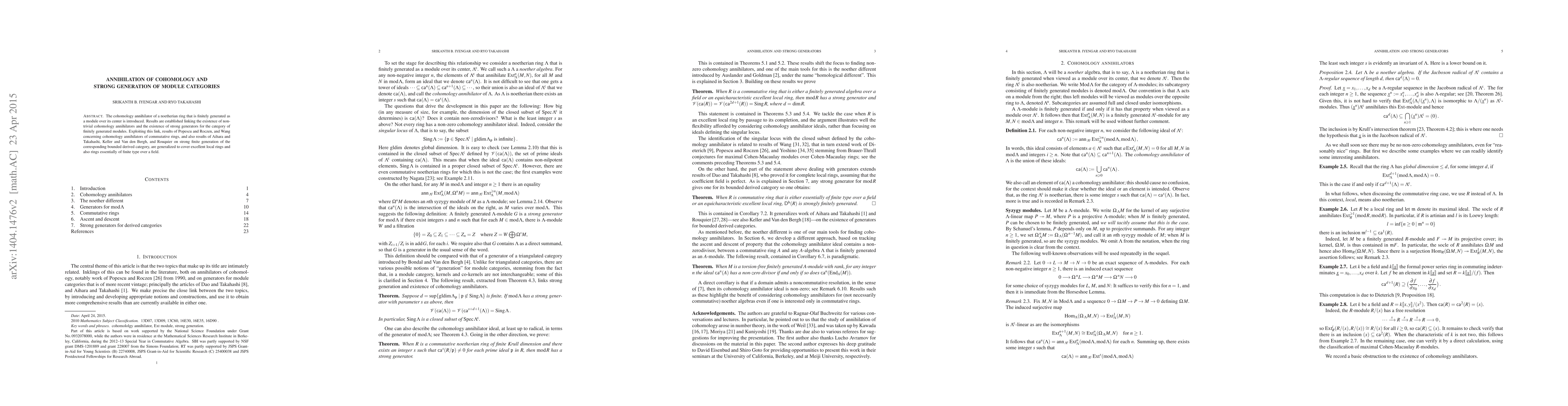 This paper introduces the concept of cohomology annihilator for noetherian rings, linking its existence to strong generators of module categories. It generalizes previous results on cohomology annihilators and strong finite generation of derived categories to include excellent local rings and rings of finite type over a field, using the established link between cohomology annihilators and strong generation.