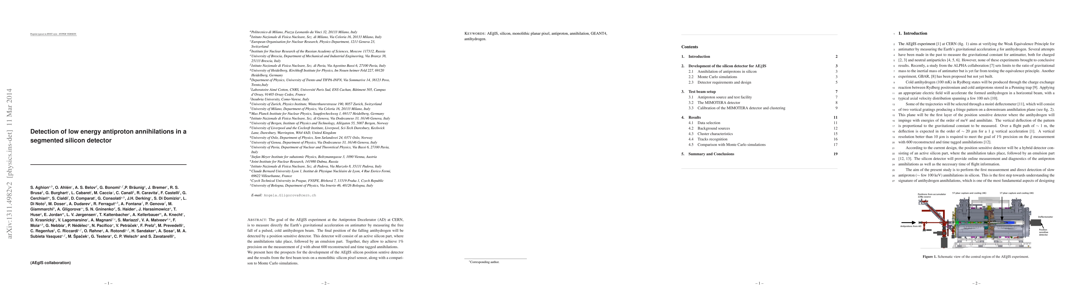 The goal of the AE$\mathrm{\bar{g}}$IS experiment at the Antiproton Decelerator (AD) at CERN, is to measure directly the Earth's gravitational acceleration on antimatter. To achieve this goal, the AE$\mathrm{\bar{g}}$IS collaboration will produce a pulsed, cold (100 mK) antihydrogen beam with a velocity of a few 100 m/s and measure the magnitude of the vertical deflection of the beam from a straight path. The final position of the falling antihydrogen will be detected by a position sensitive detector. This detector will consist of an active silicon part, where the annihilations take place, followed by an emulsion part. Together, they allow to achieve 1$%$ precision on the measurement of $\bar{g}$ with about 600 reconstructed and time tagged annihilations. We present here, to the best of our knowledge, the first direct measurement of antiproton annihilation in a segmented silicon sensor, the first step towards designing a position sensitive silicon detector for the AE$\mathrm{\bar{g}}$IS experiment. We also present a first comparison with Monte Carlo simulations (GEANT4) for antiproton energies below 5 MeV