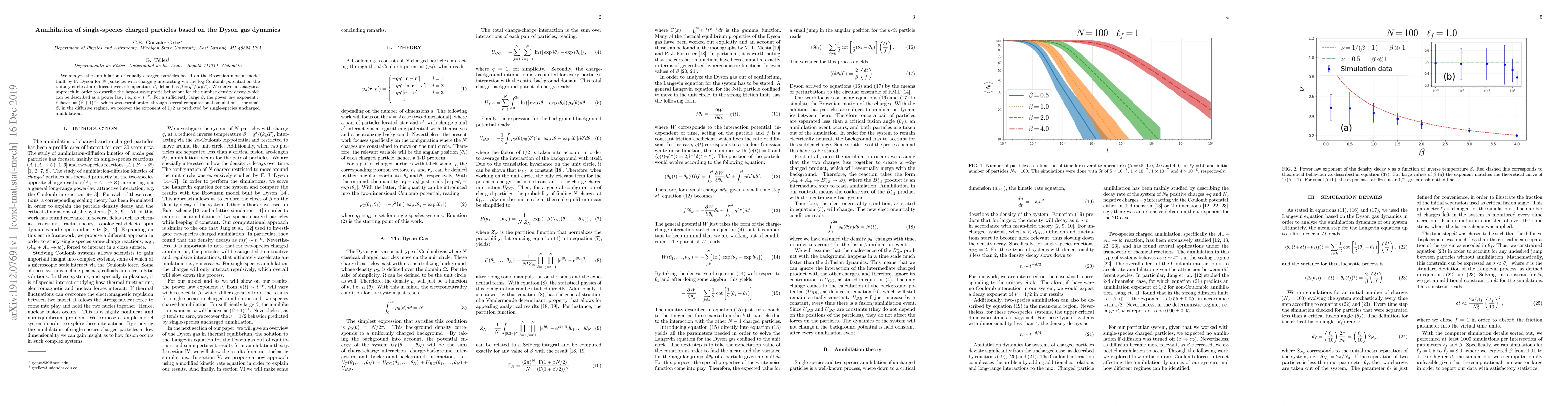 This paper investigates the annihilation of charged particles using the Dyson gas model, finding that for large temperatures, the number density decay follows a power law with an exponent related to the inverse temperature. For small temperatures, it recovers the expected exponent of 1/2 in the diffusive regime.