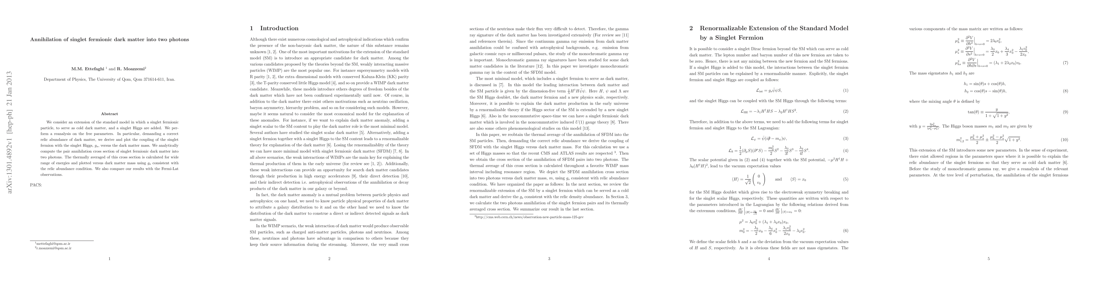 This paper extends the standard model by introducing a singlet fermionic dark matter particle and a singlet Higgs, analyzing their coupling to achieve the correct relic abundance. It computes the annihilation cross section of this dark matter into two photons and compares the results with Fermi-Lat observations.