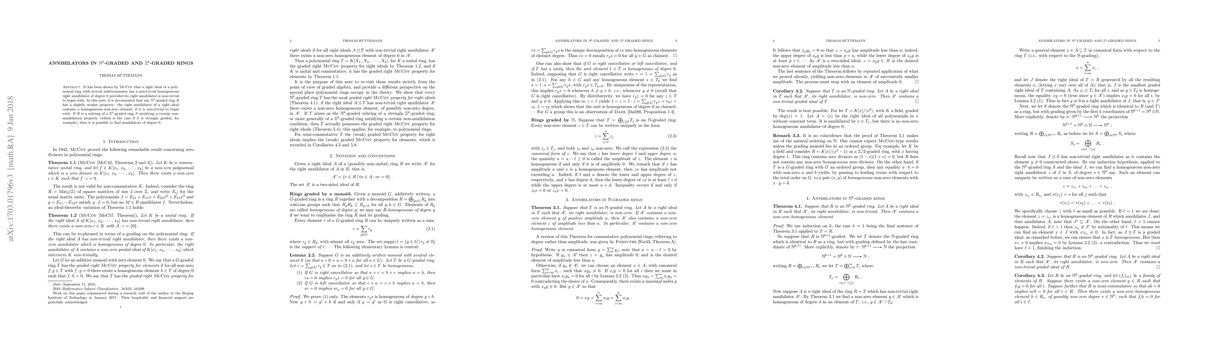 A polynomial ring with several indeterminates has a homogeneous right annihilator of degree 0 if its right annihilator is non-trivial. Any $ abbb{N}$-graded ring $R$ has a similar property: the right annihilator contains a homogeneous non-zero element.