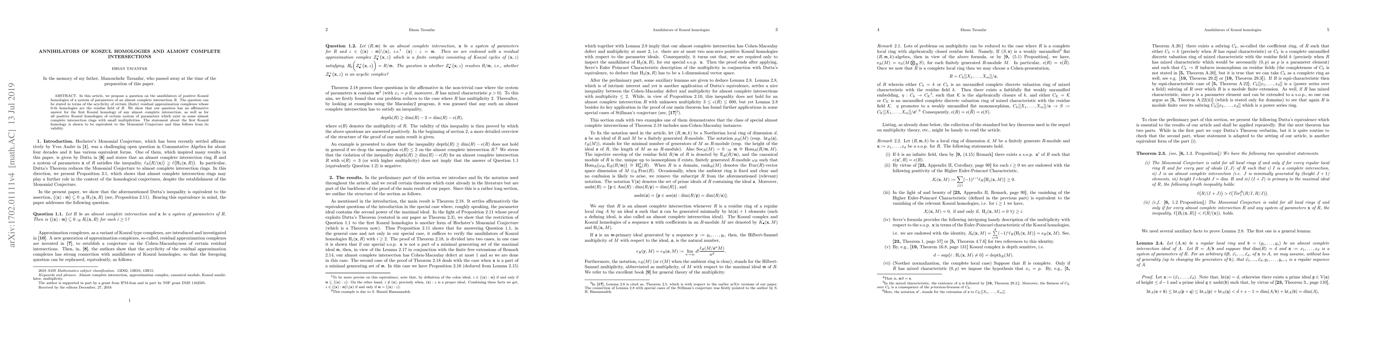 In this article, we propose a question on the annihilators of positive Koszul homologies of a system of parameters of an almost complete intersection $R$. The question can be stated in terms of the acyclicity of certain (finite) residual approximation complexes whose $0$-th homologies are the residue field of $R$. We show that our question has an affirmative answer for the first Koszul homology of any almost complete intersection, as well as for all positive Koszul homologies of certain system of parameters which exist in some almost complete intersection rings with small multiplicities. The statement about the first Koszul homology is shown to be equivalent to the Monomial Conjecture and thus follows from its validity.