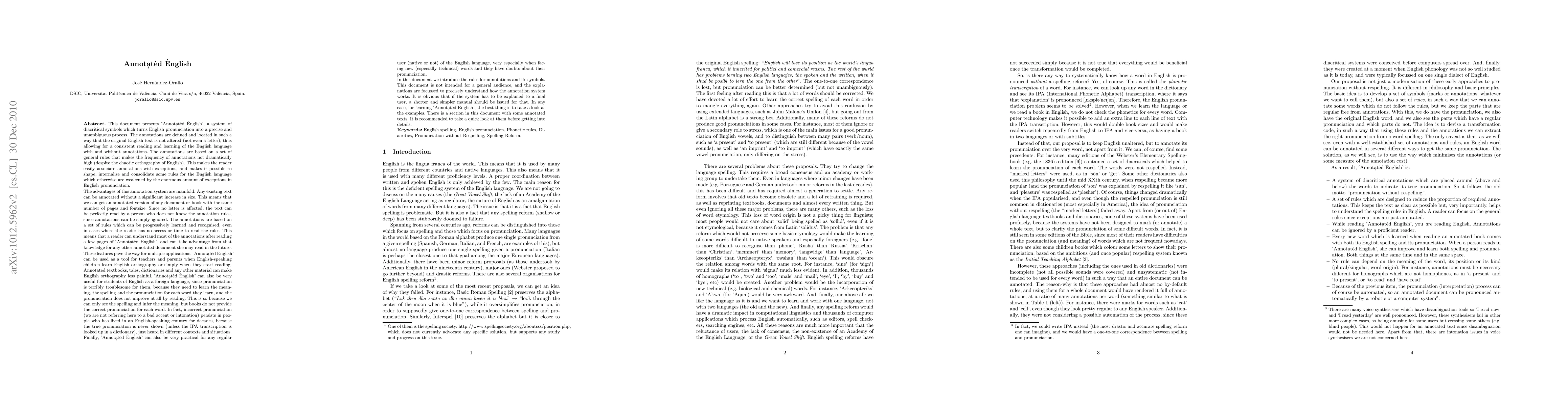 This document presents Annotated English, a system of diacritical symbols which turns English pronunciation into a precise and unambiguous process. The annotations are defined and located in such a way that the original English text is not altered (not even a letter), thus allowing for a consistent reading and learning of the English language with and without annotations. The annotations are based on a set of general rules that make the frequency of annotations not dramatically high. This makes the reader easily associate annotations with exceptions, and makes it possible to shape, internalise and consolidate some rules for the English language which otherwise are weakened by the enormous amount of exceptions in English pronunciation. The advantages of this annotation system are manifold. Any existing text can be annotated without a significant increase in size. This means that we can get an annotated version of any document or book with the same number of pages and fontsize. Since no letter is affected, the text can be perfectly read by a person who does not know the annotation rules, since annotations can be simply ignored. The annotations are based on a set of rules which can be progressively learned and recognised, even in cases where the reader has no access or time to read the rules. This means that a reader can understand most of the annotations after reading a few pages of Annotated English, and can take advantage from that knowledge for any other annotated document she may read in the future.