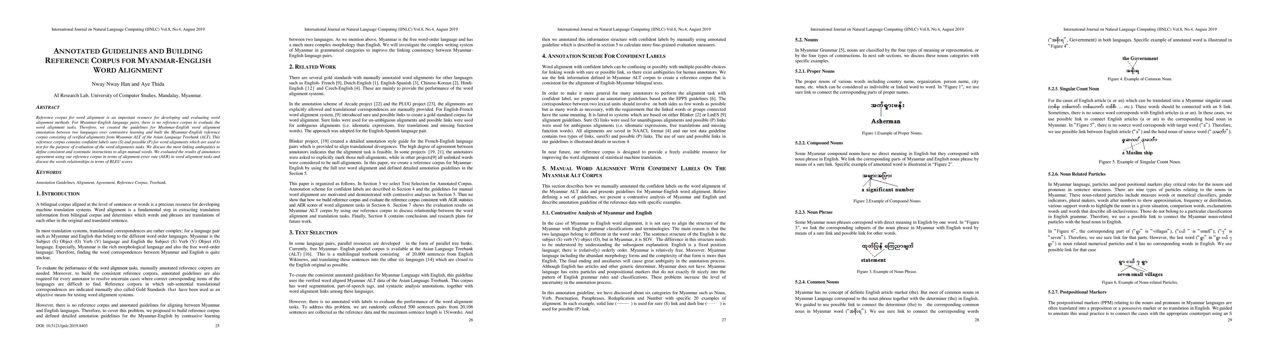 This paper presents guidelines and a reference corpus for Myanmar-English word alignment, addressing the lack of such resources for this language pair. The corpus includes verified alignments with labels for confident and possible matches, facilitating the evaluation of word alignment methods.